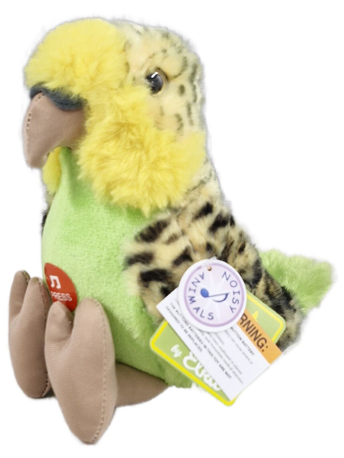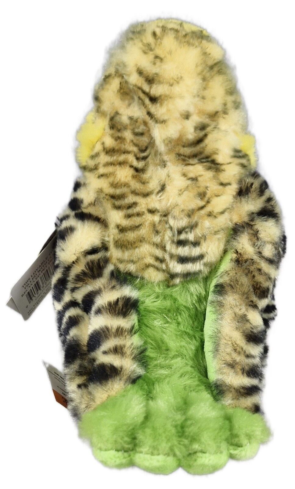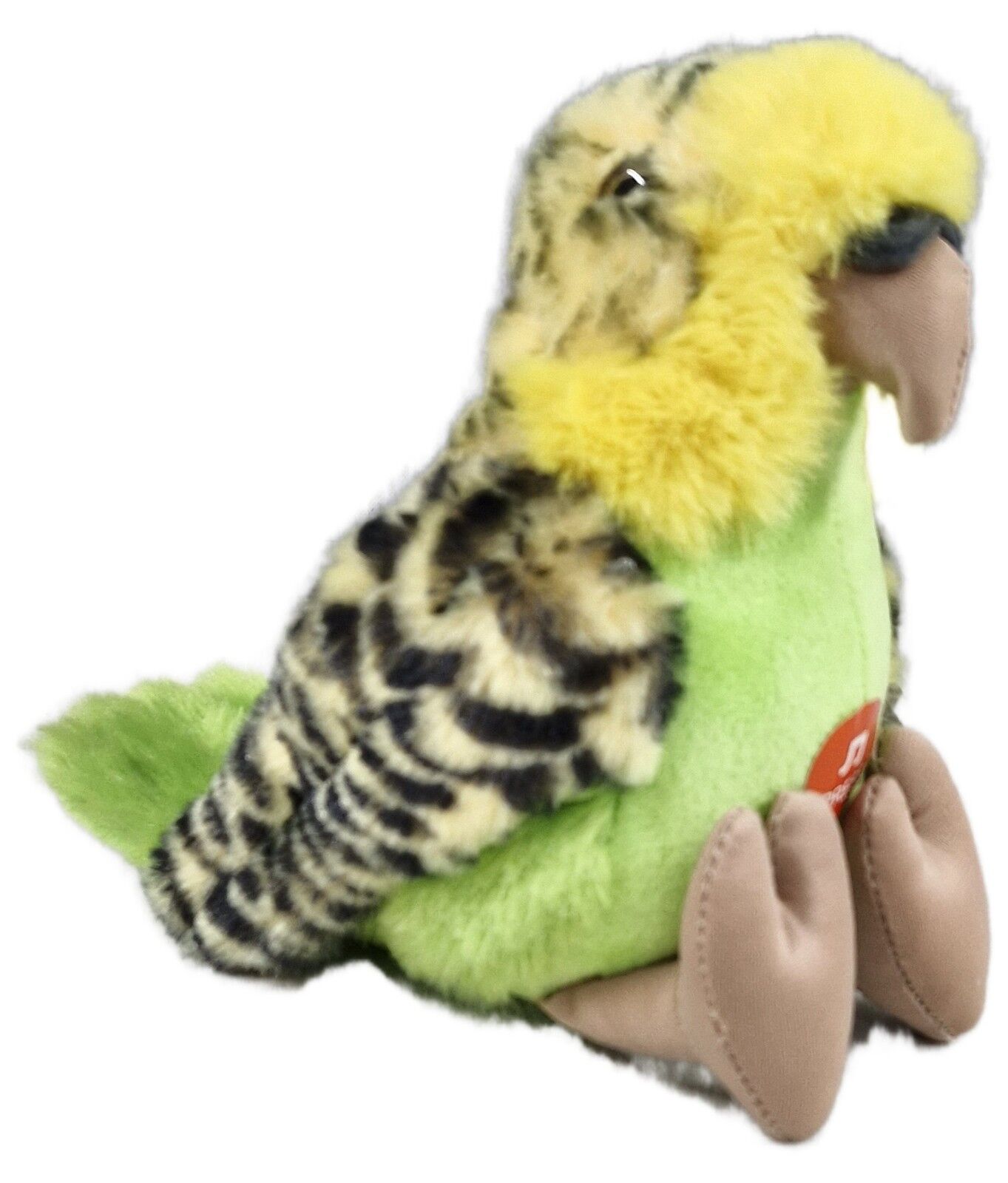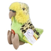 Beautiful soft plush toy, yellow and green budgerigar bird or budgie with sound chip. Press the birds belly and listen to the sound this cute plush budgerigar makes.
