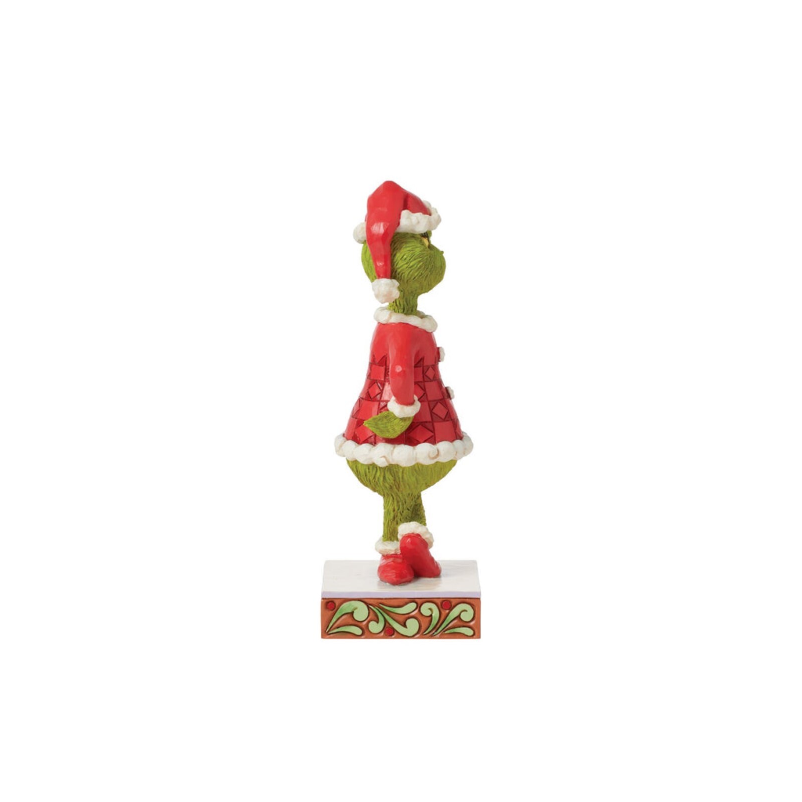 This Jim Shore design features The Grinch with his hands on his hips wearing a frown. Dressed as Santa Claus, The Grinch wears a patchwork red suit on a rosemale stage. He plots to steal Christmas spirit with style and snark!