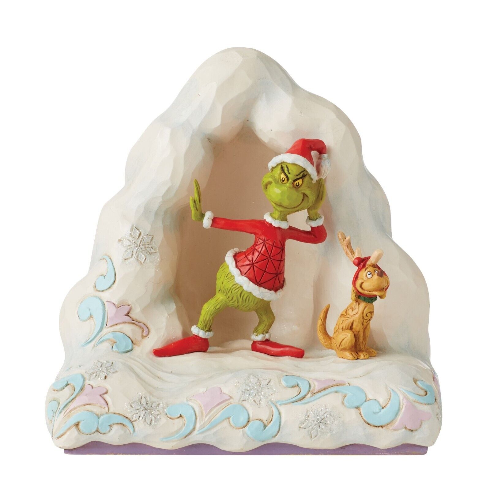 Leaving his cave for the first time in months, The Grinch dresses as Santa to descend his hermit mountain with his dog Max. This stunning Jim Shore figurine brings the pair to life as the partners in crime sneak into town to steal Christmas joy.