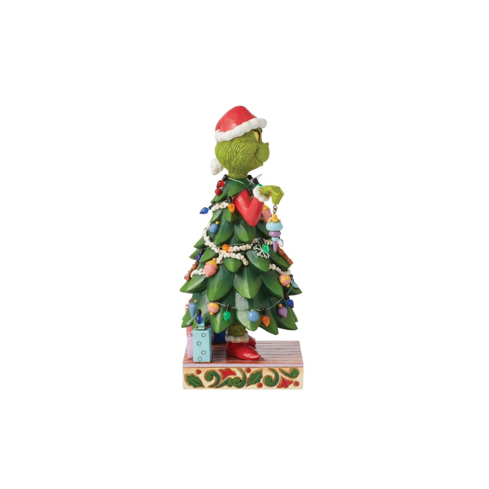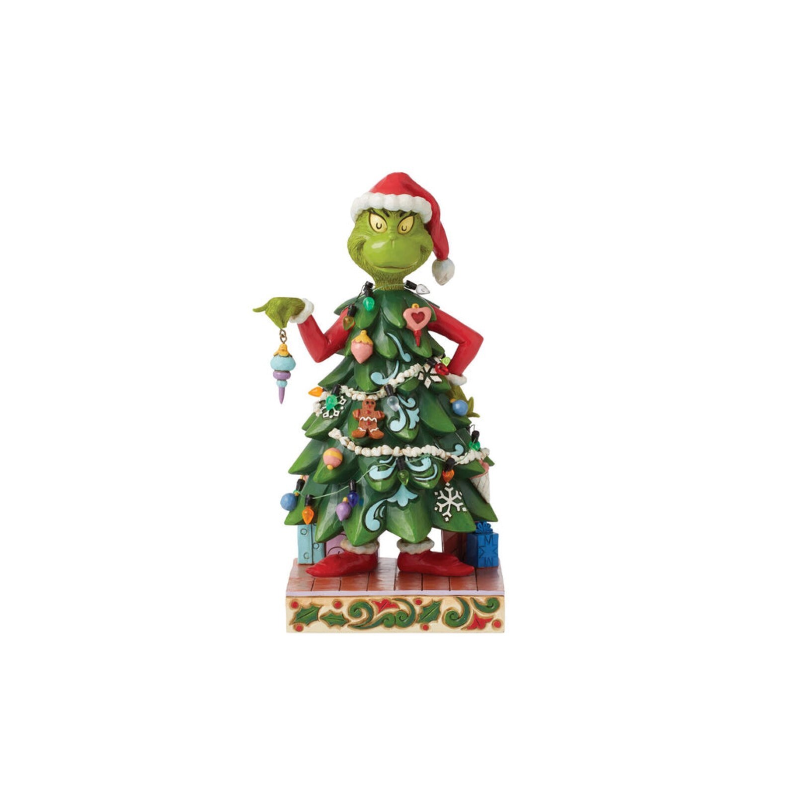 With a heart enlarged with holiday spirit and love, The Grinch smiles sincerely in this festive Jim Shore design. Dressed as a Christmas tree, Grinch wears a Santa hat and holds an ornament. This piece brings warmth to winter with decorative details.