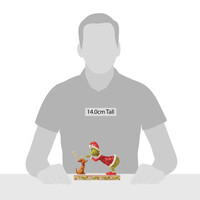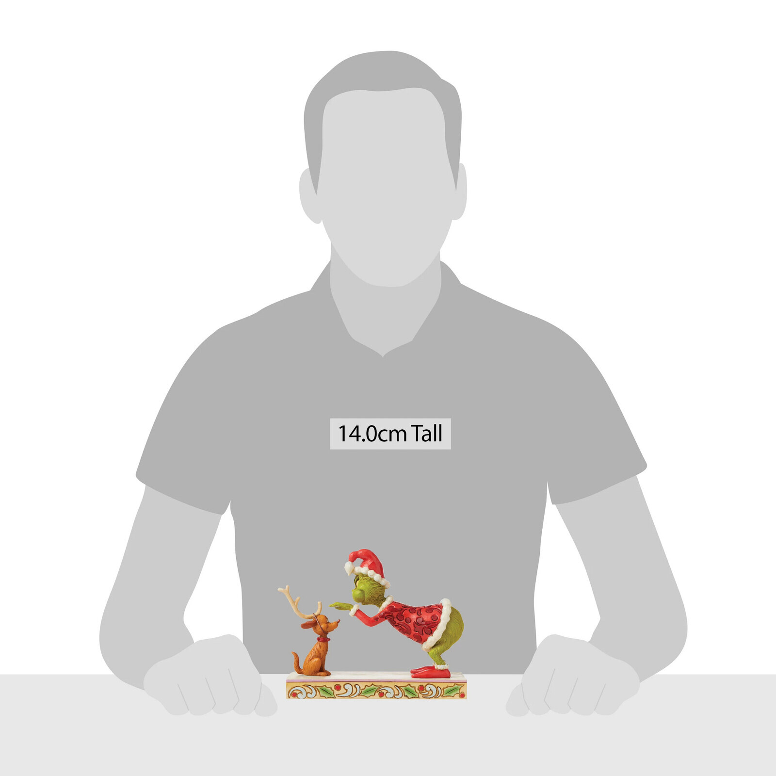 Perhaps the only thing the Grinch sort of cares about is Max the dog. He sits happily with reindeer antlers strapped to his head as Santa Grinch gives him a rough pat. The pup steers the towering sleigh of stolen presents home in this Jim Shore classic.