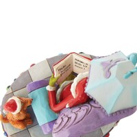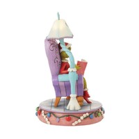 This Jim Shore creation features The Grinch reading in a large rosemale blue and purple chair. With a light-up lamp, Grinch reads his Dr. Seuss book dressed as Santa. His loyal dog, Max, sits by his side. Enjoy Christmas with this classic character!