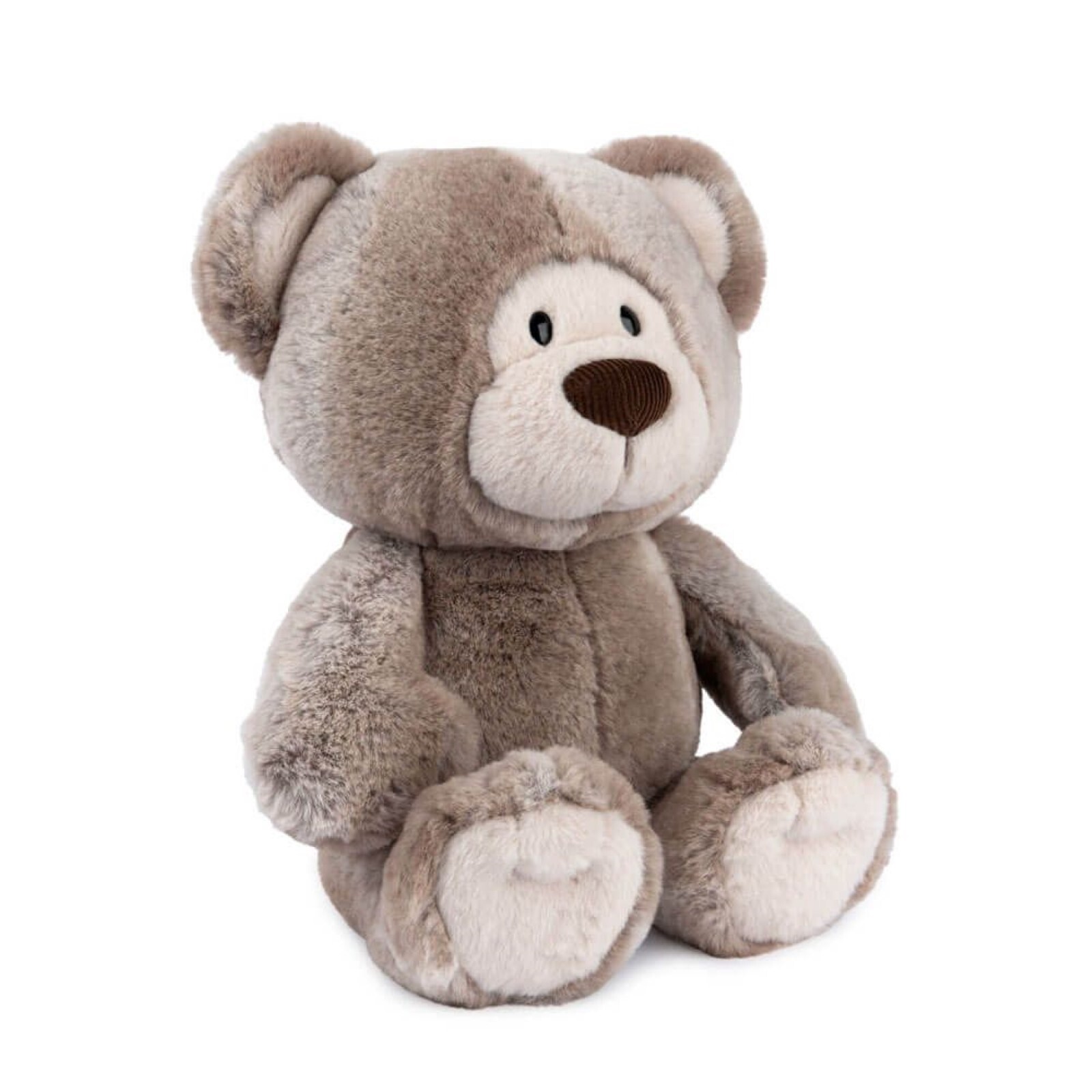 • Plump bear with lush, woodgrain-inspired two-tone fur, a corduroy nose, and a cream-colored muzzle and paws