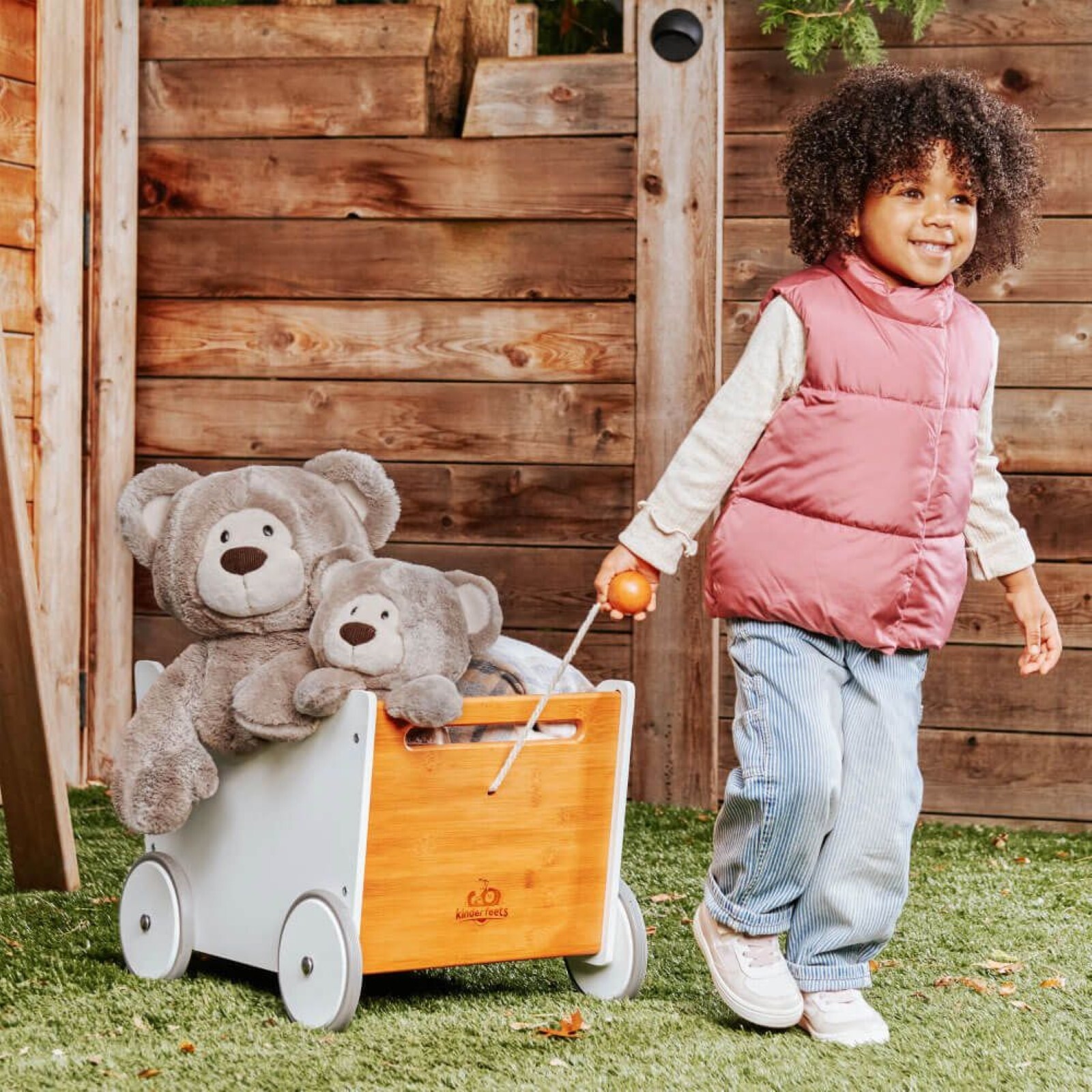 • Plump bear with lush, woodgrain-inspired two-tone fur, a corduroy nose, and a cream-colored muzzle and paws