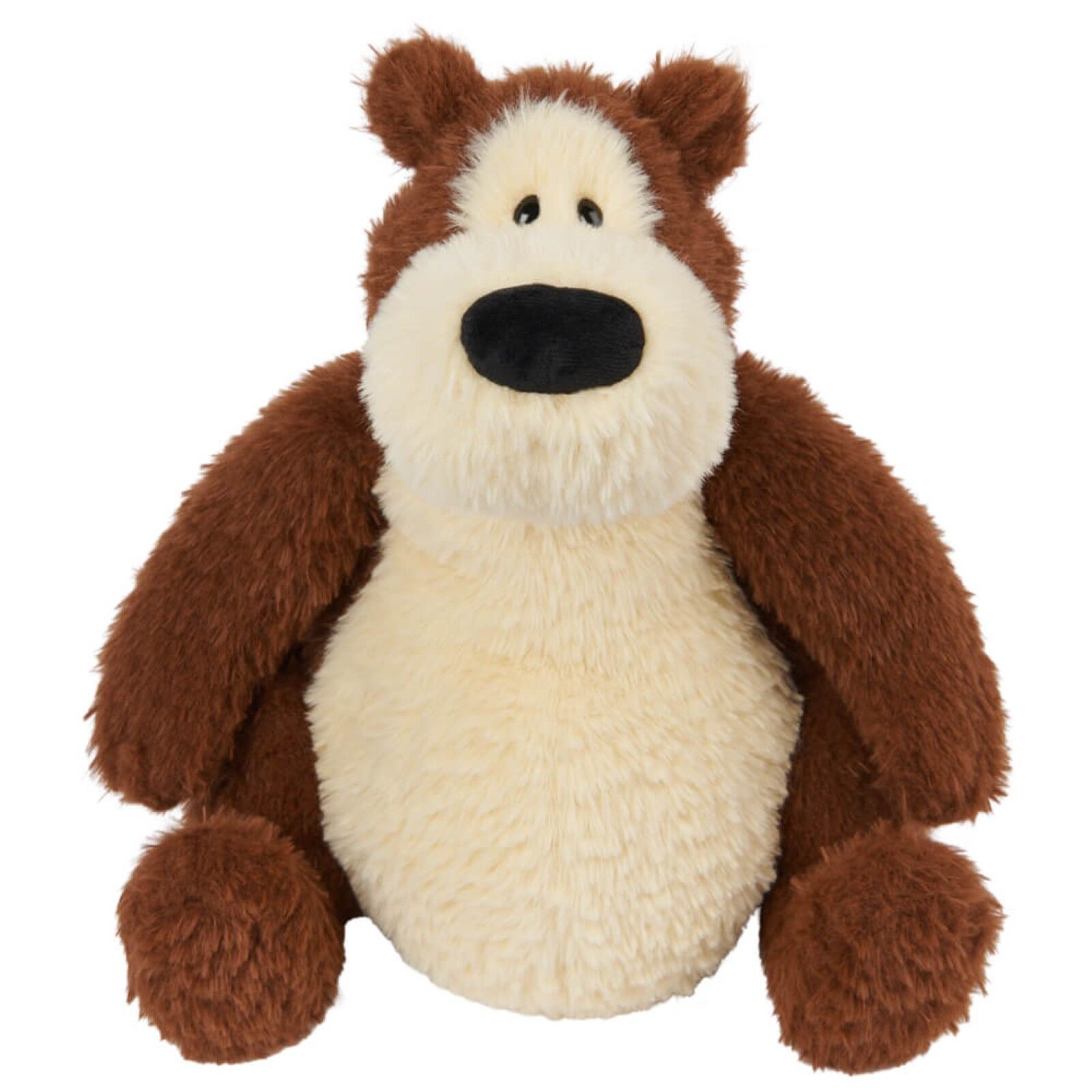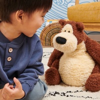 Goober sits upright, balanced by an extra-plump, squishy round belly and a bottom weighted with beans that help him sit upright. His premium, luxuriously soft chocolate-and-vanilla two-tone plush is accented by a large, black plush nose and wide-eyed, curious-looking expression.