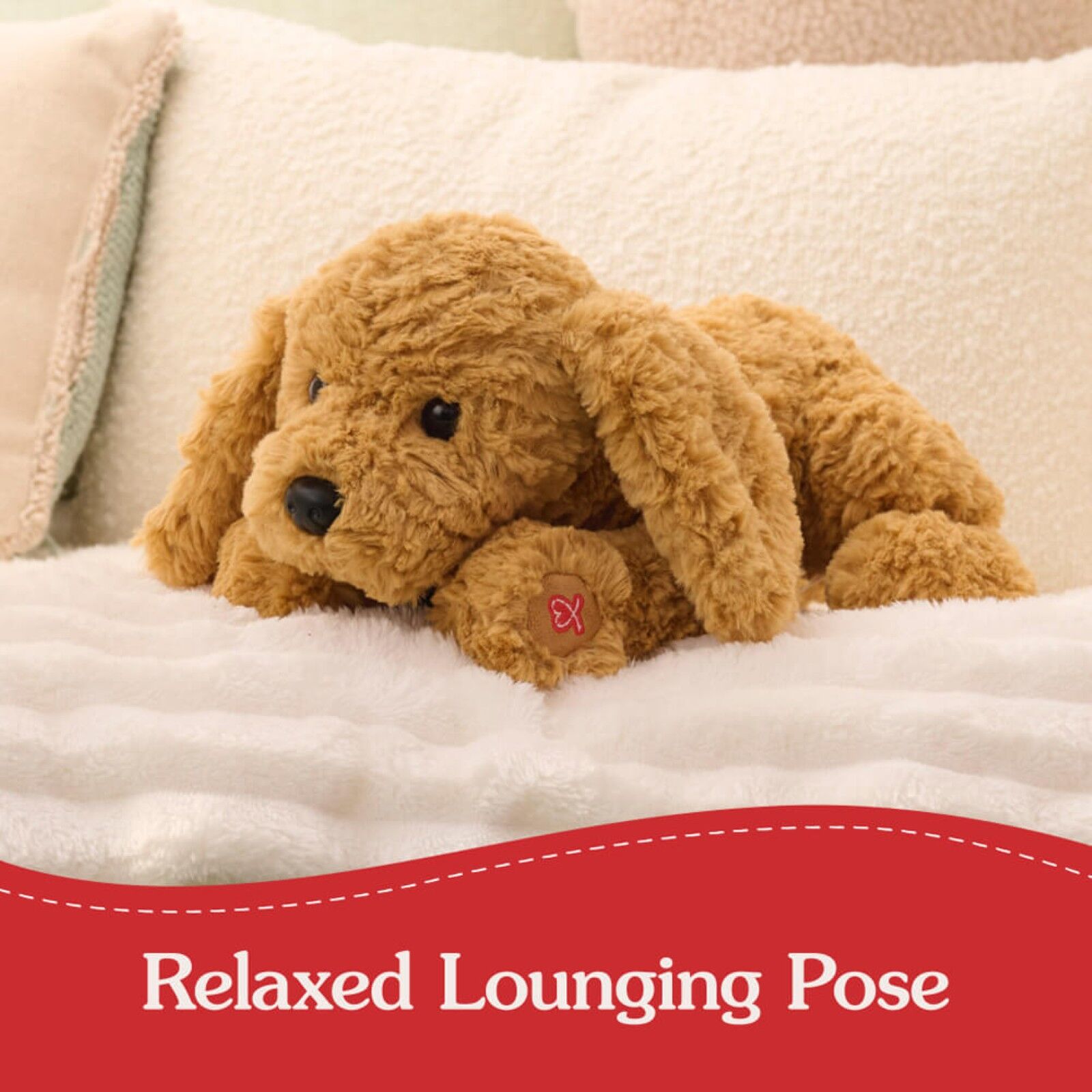 You may notice a special new feature on Muttsy puppy. As part of GUND's Forever Friends collection, Muttsy has a red stitch heart on his left paw. This stitch is GUND's universal symbol of connection and the love someone feels when holding their favourite stuffed friend. This provides extra security for on-the-go play and all types of adventures.