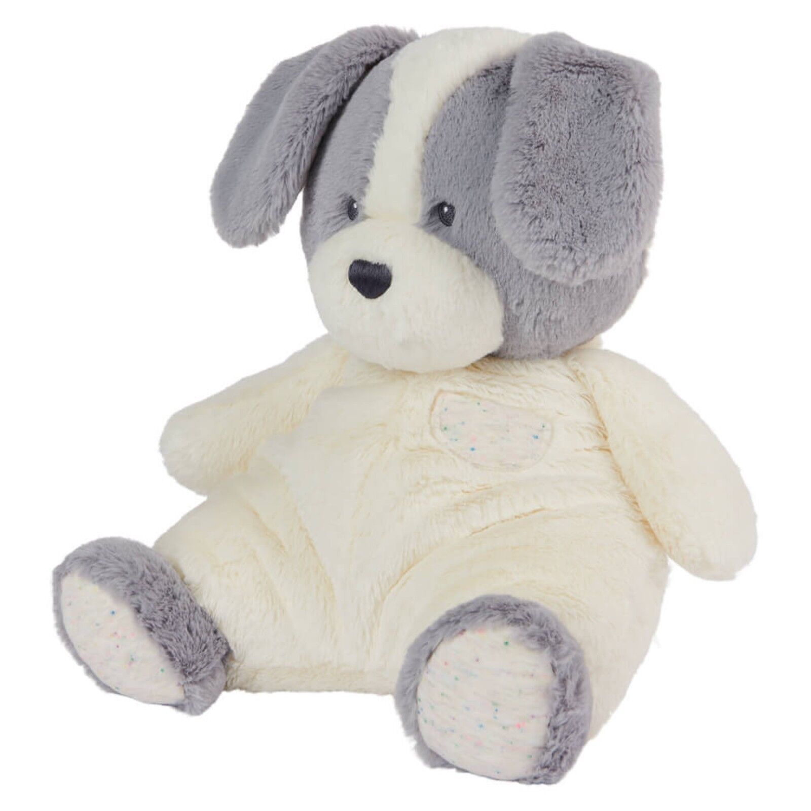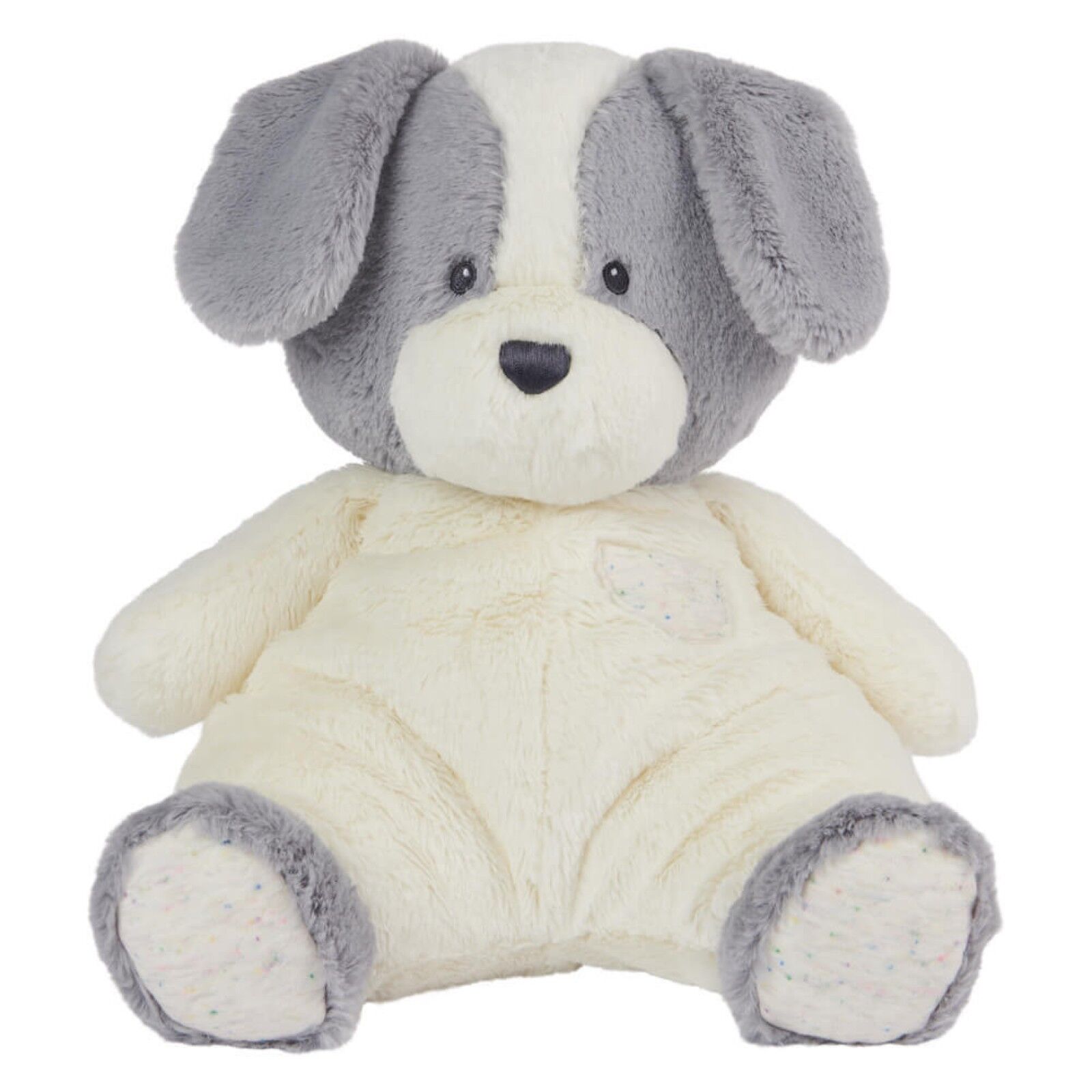 The Oh So Snuggly Puppy is a super-soft, modern take on a classic plush puppy dog with white plush and grey spots over both eyes.
