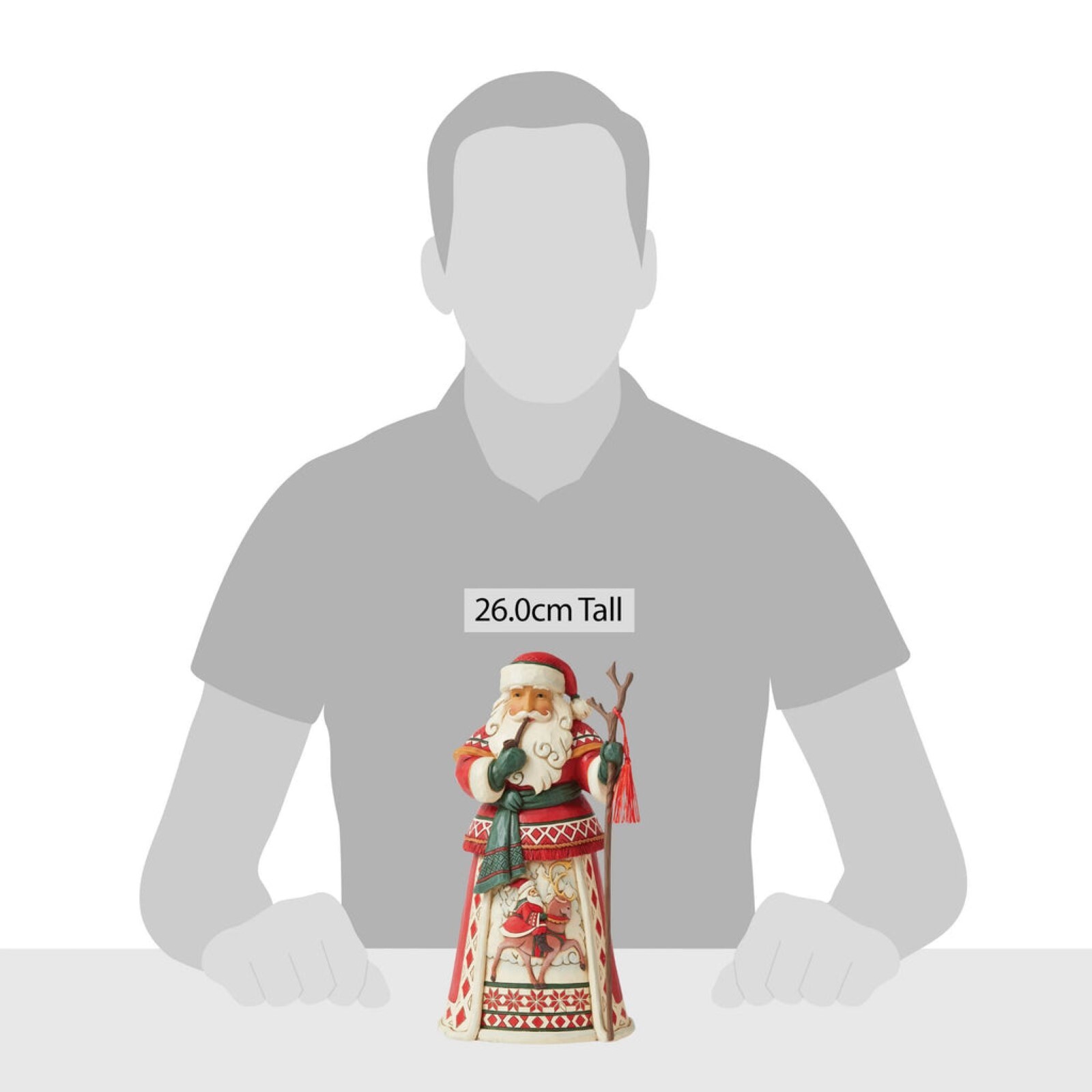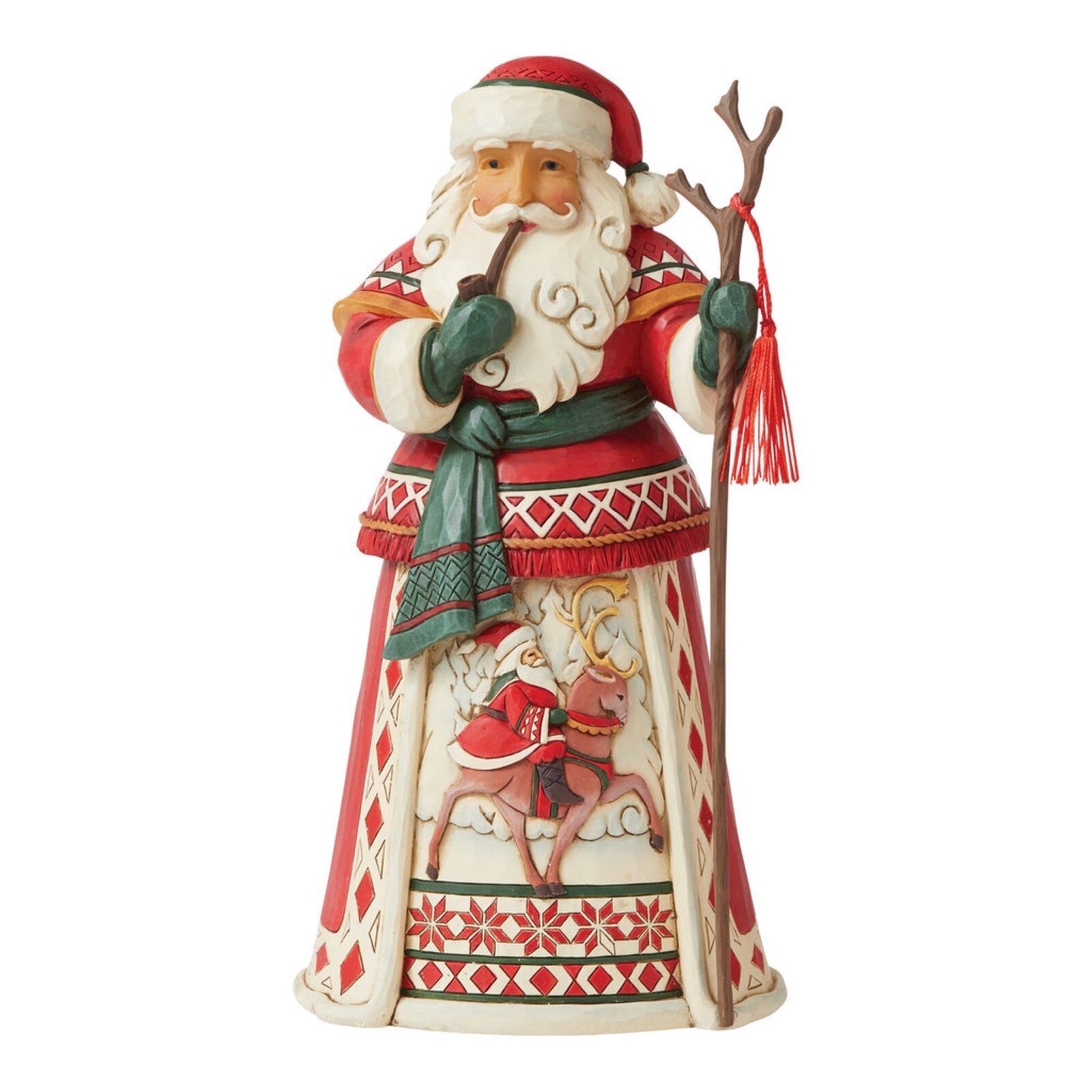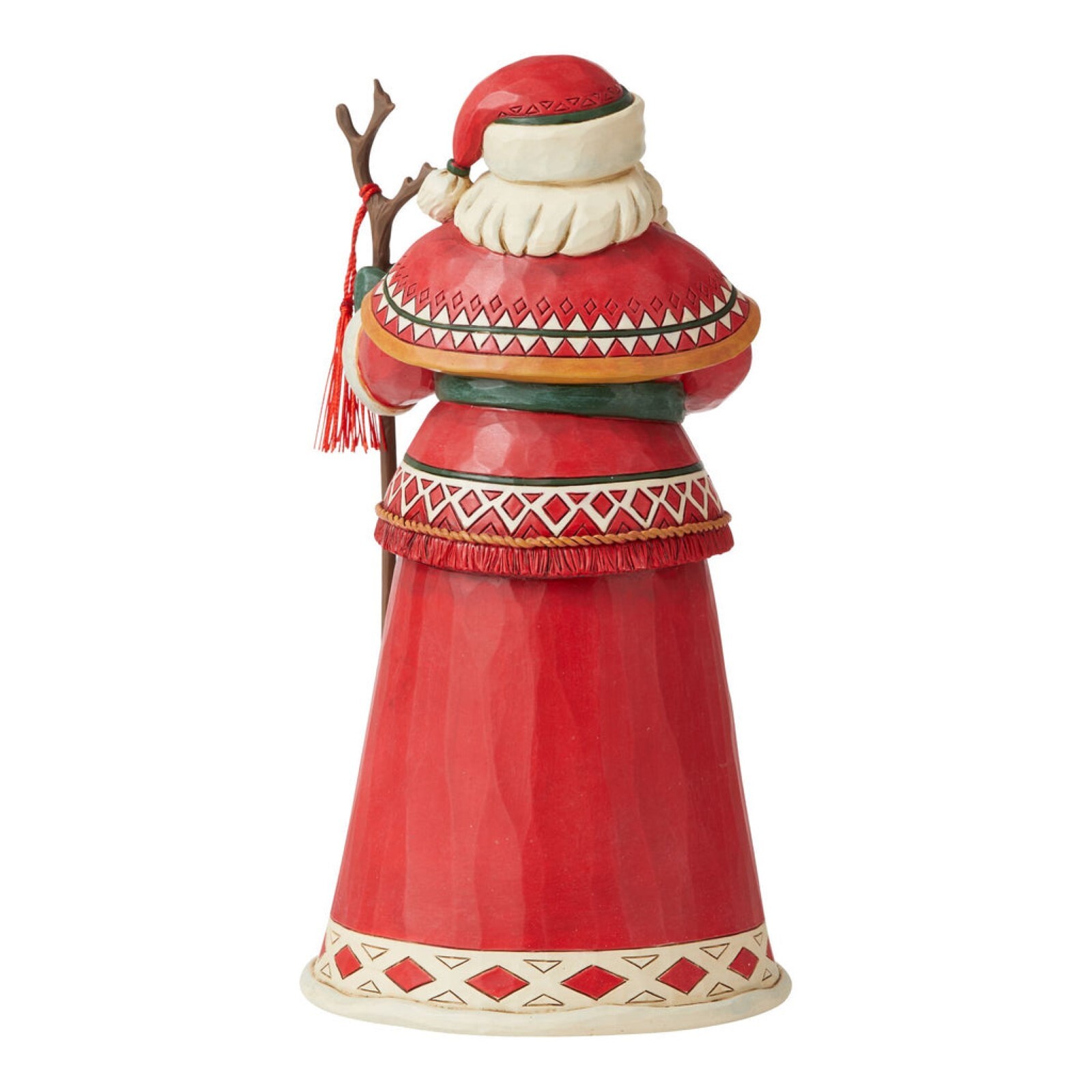 Santa reflects on his Yuletide ride in this 14th Annual Jim Shore Lapland Santa figurine. With a branch walking stick and thermal robes, Santa is well dressed for a frolic through the forest. His gown reveals a detailed reindeer scene.
