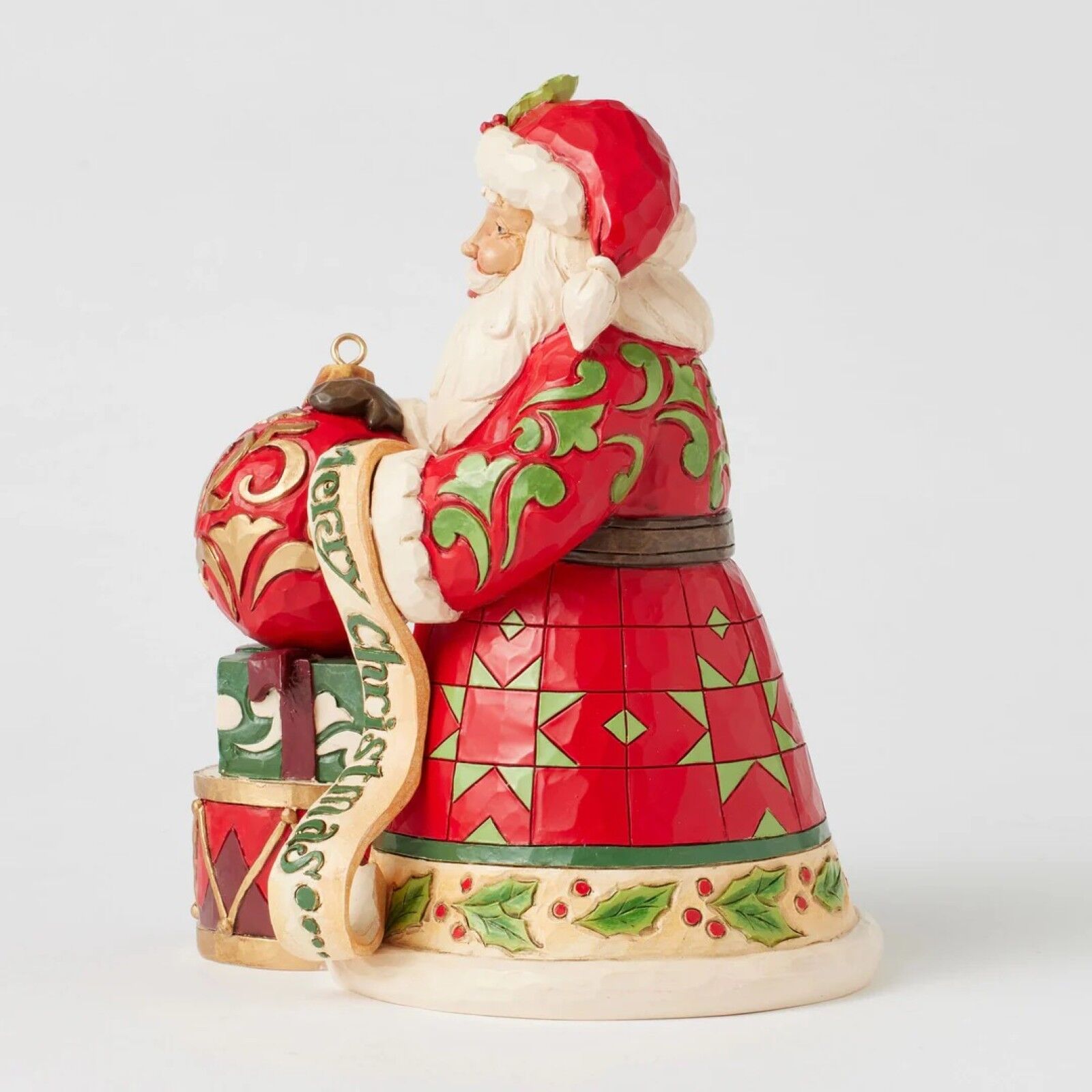 This Jim Shore Hallmark Exclusive Santa celebrates 2025 with timeless charm, standing beside an ornament marking the year. Donning Jim Shore's signature rosemaling and patchwork designs, Santa holds a long "Merry Christmas" list with infectious joy.