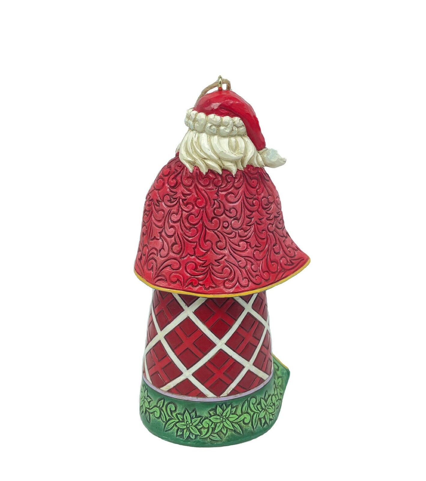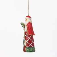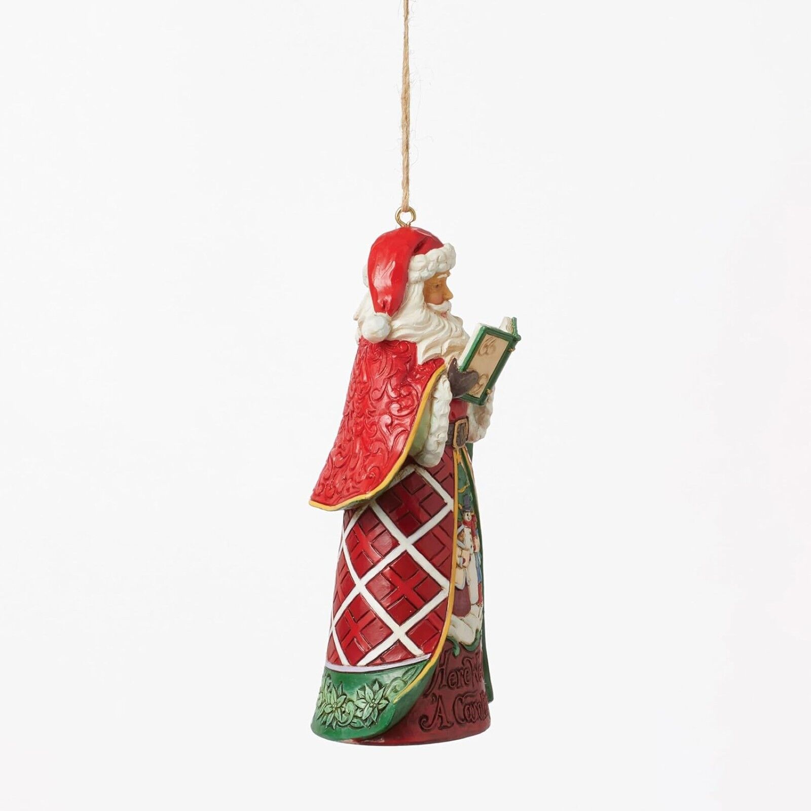 Singing along cheerfully with a song book, Santa goes a-caroling in plaid robes and rosemaling cloak. With a caroler snowman scene framed on his gown, Santa knows music makes the holidays happier. Hang this ornament in your tree to feel the music.