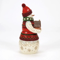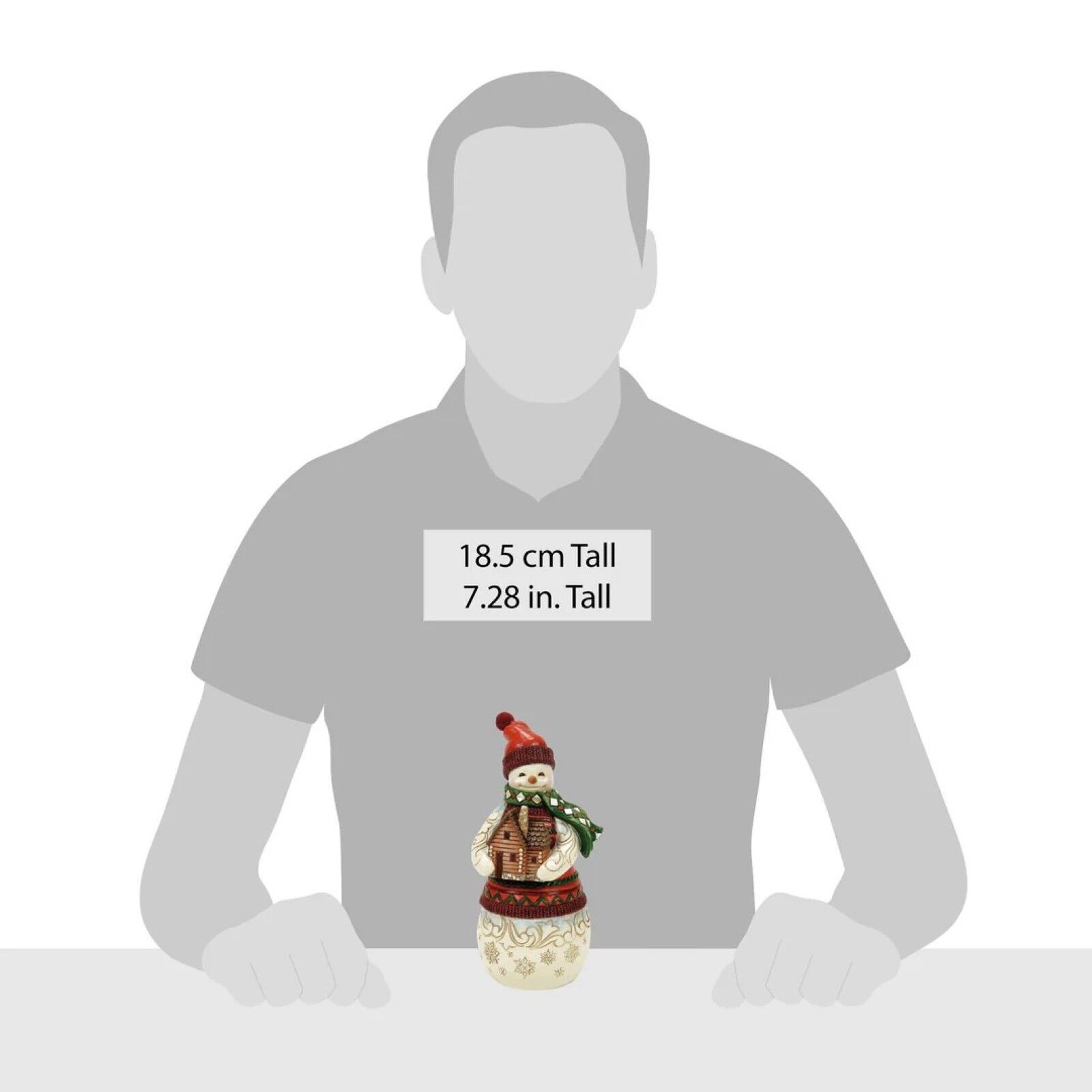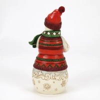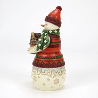 This Christmas at the Lodge Jim Shore snowman is dressed in an intricate red and green tunic and holds a little log cabin. With a knit cap, rosy cheeks, and a joyful smile, he glows with rosemaling and snowflakes, bringing festive warmth and cozy cabin vibes.