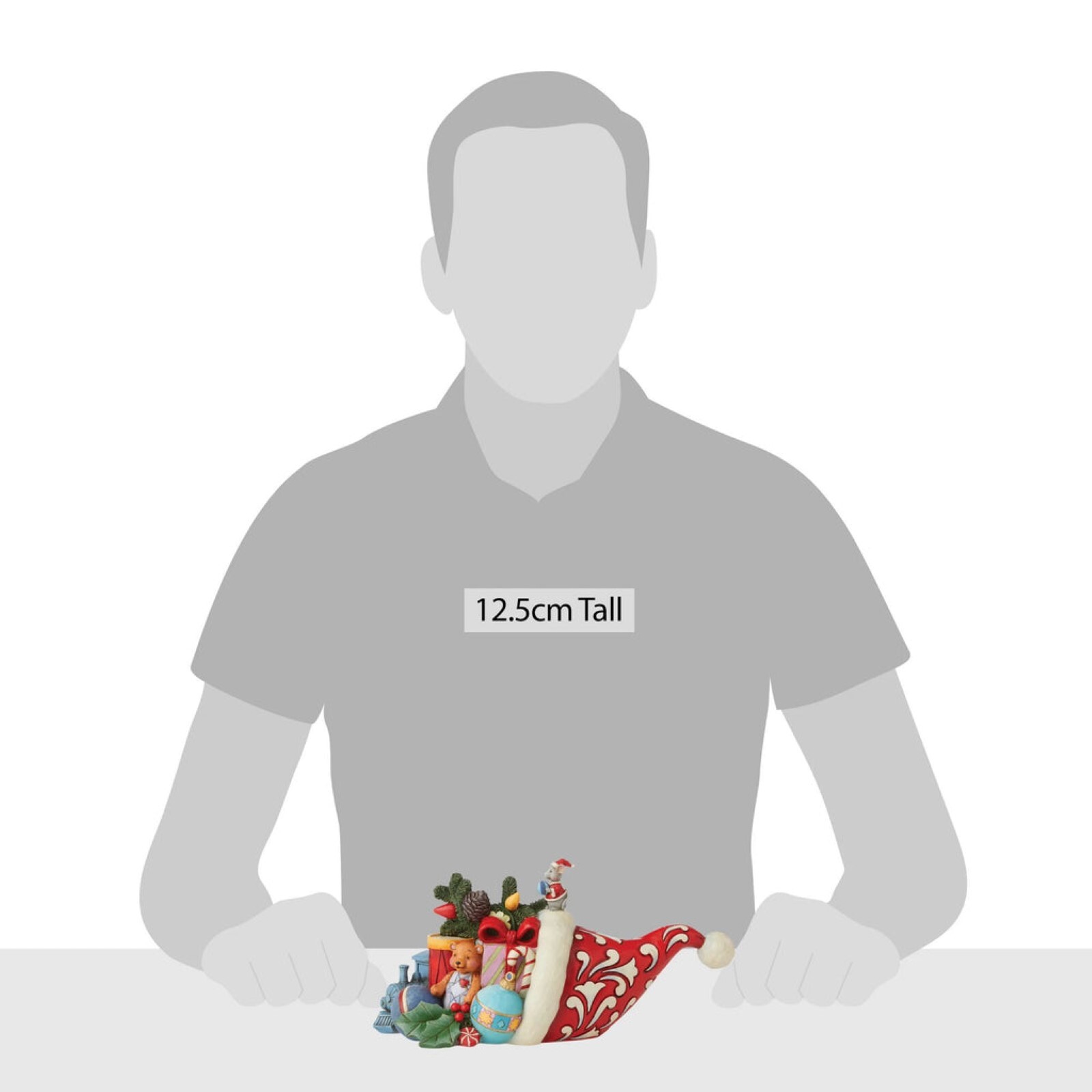 This Jim Shore cornucopia of holiday cheer is fashioned from a Santa hat. Overflowing from the hat is all manner of seasonal stimulation including toys, pine cones, ornaments and holly. A mouse in a tiny Santa suit sits atop the Christmas cornucopia.