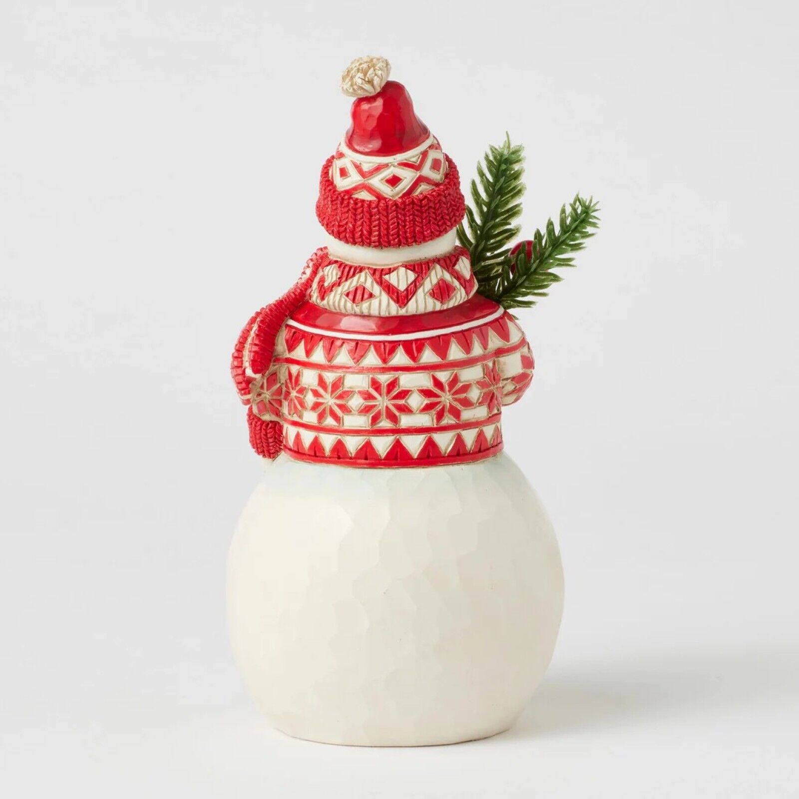 This cheerful Jim Shore Nordic Noel snowman is dressed in an intricately patterned red Nordic sweater, scarf, and hat, radiating warmth and holiday spirit. With a bright smile, he holds a fresh evergreen sprig in his hands, eagerly embracing the joys of