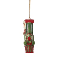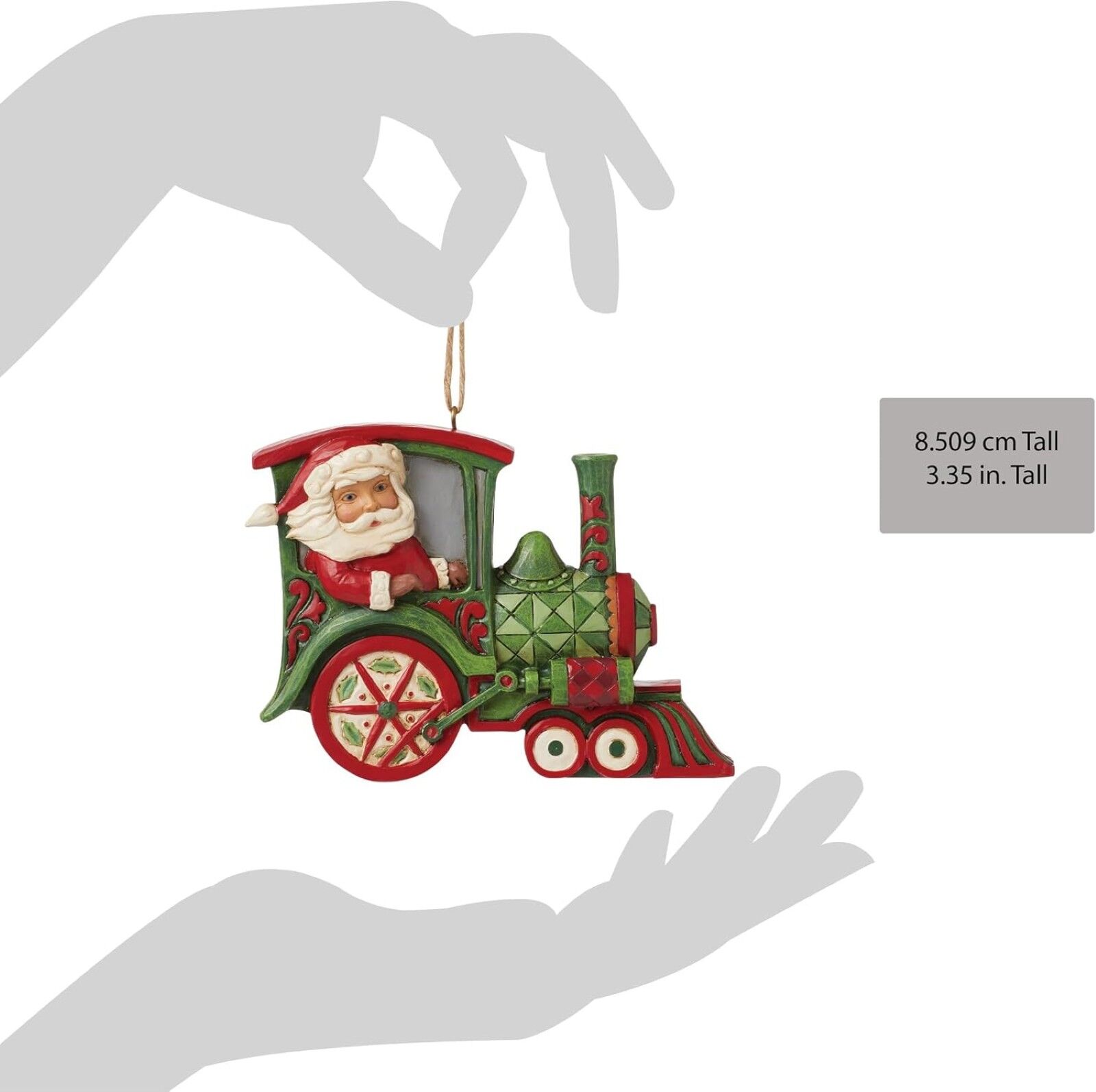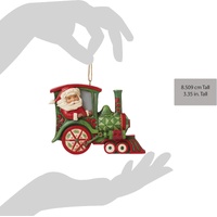 All aboard the Christmas train! Next stop - holiday memories! Santa steers this fantastic red and green rosemaling locomotive with mistletoe-powered wheels. Hang this stylish train in your tree and admire the creative craftsmanship of Jim Shore.
