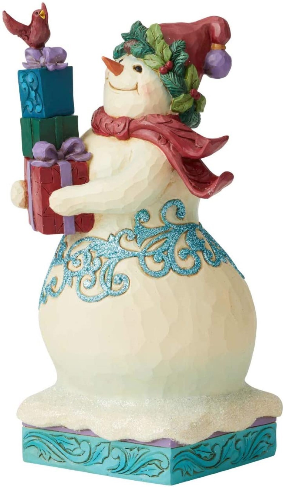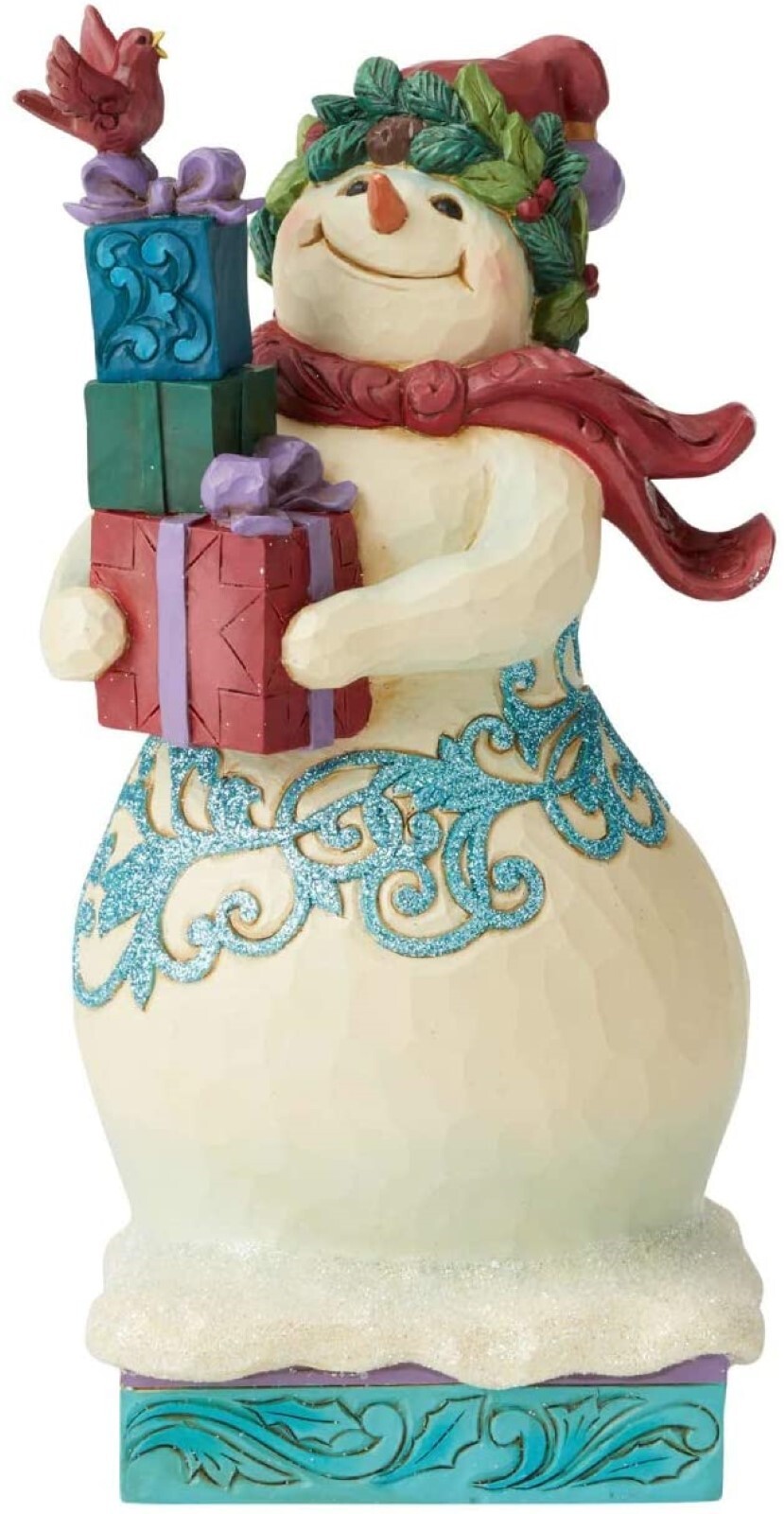 This whimsical Snowman holds a stack of colourfully wrapped Christmas presents with a friendly Cardinal perched on top.