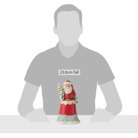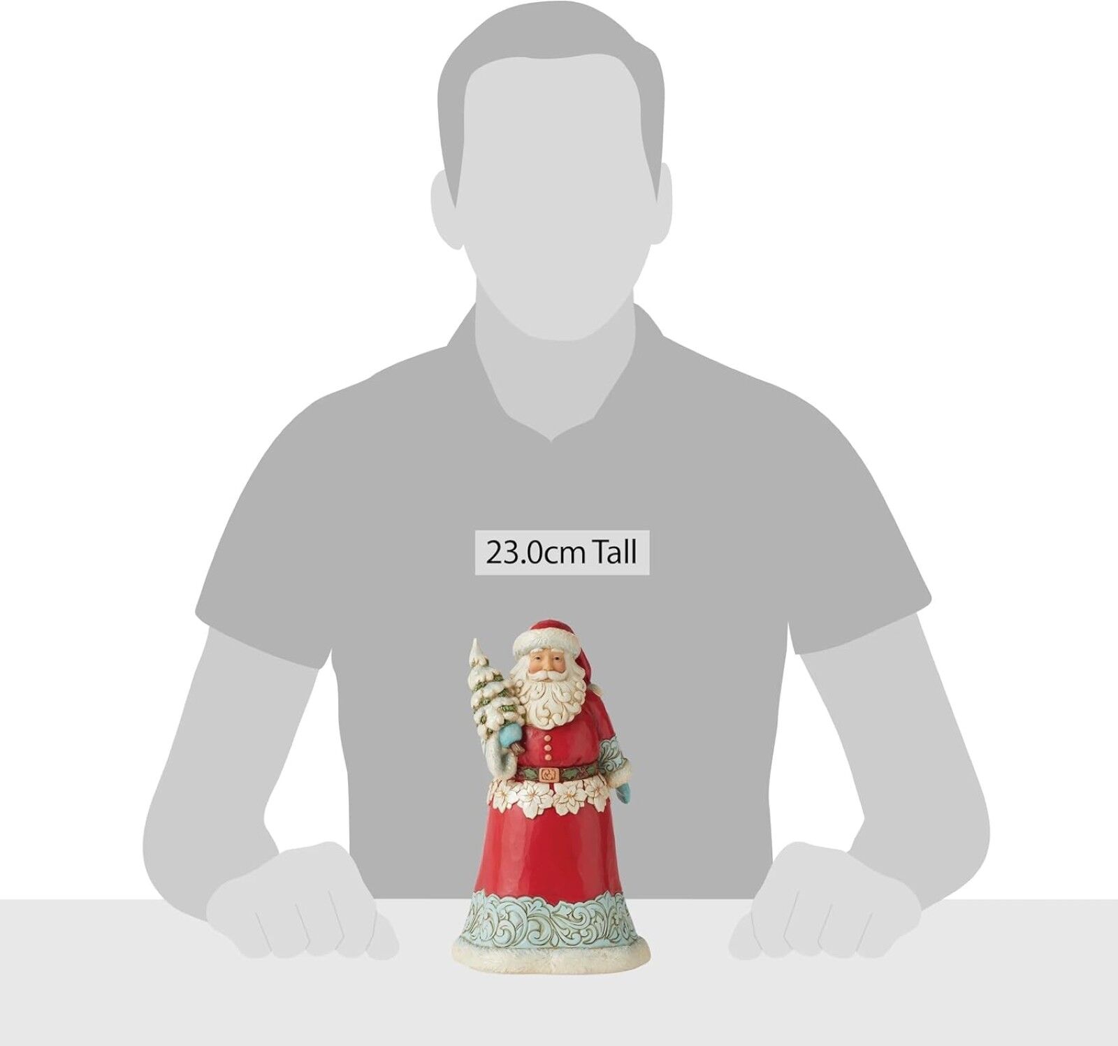 This Winter Wonderland Santa statuette wears an intricate rosemaled cloak brimmed in white poinsettias and holly patterned belt. With a beard full of curls and rosy cheeks, Santa giddily carries a snow glistened tree in his hand for your home.