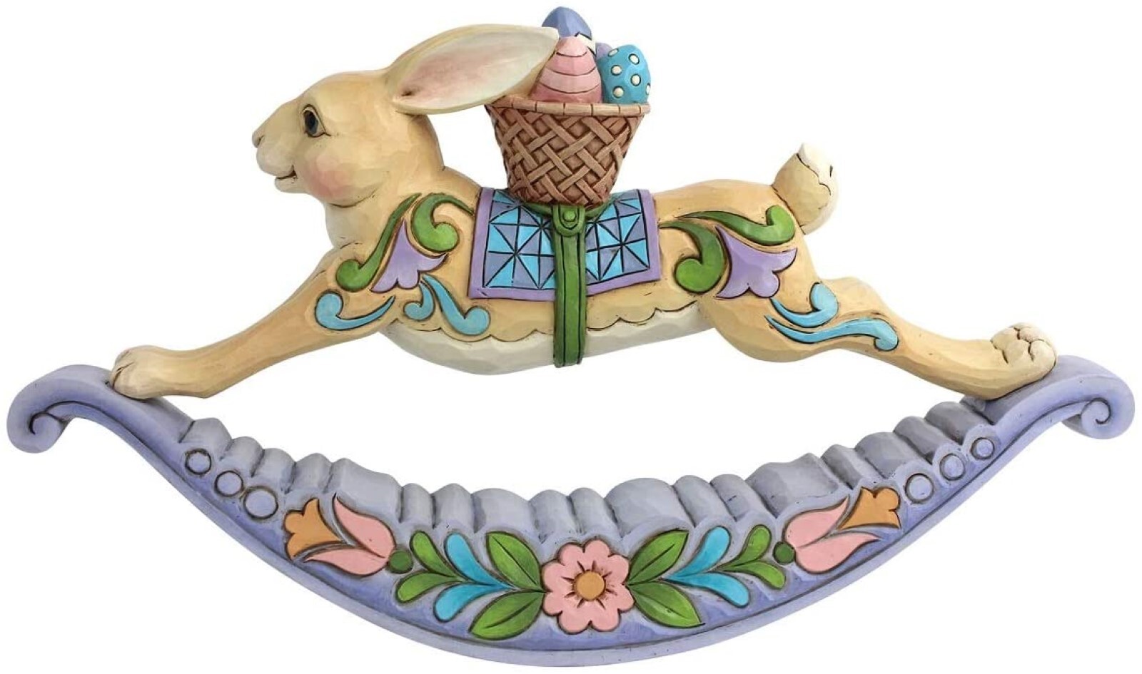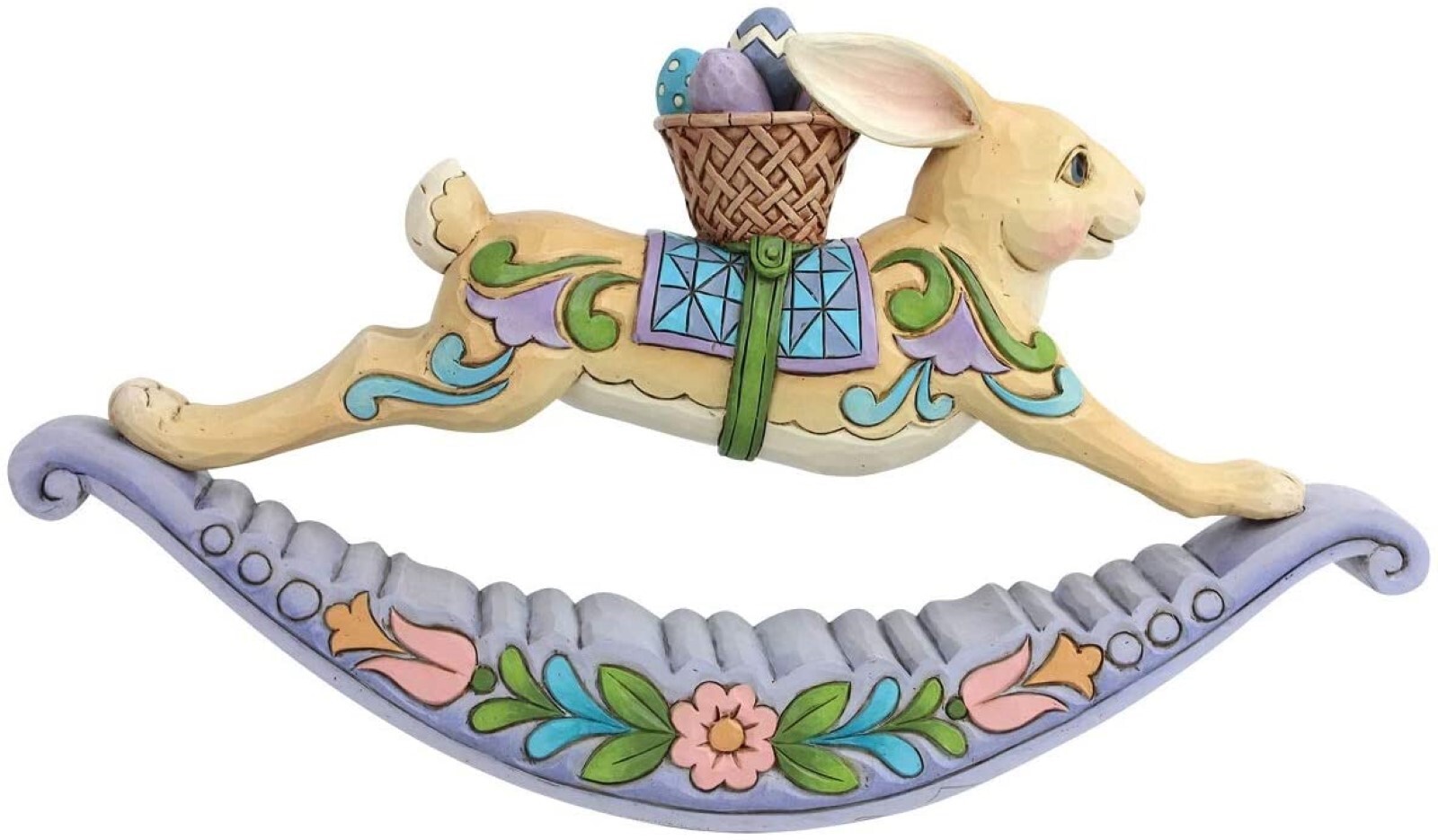 This handcrafted Rocking Bunny is a delightful holiday accent from the artistry of Jim Shore. Beautifully decorated in springtime hues this folk-art inspired Bunny balances a basket of eggs as he rocks his way Easter morning.