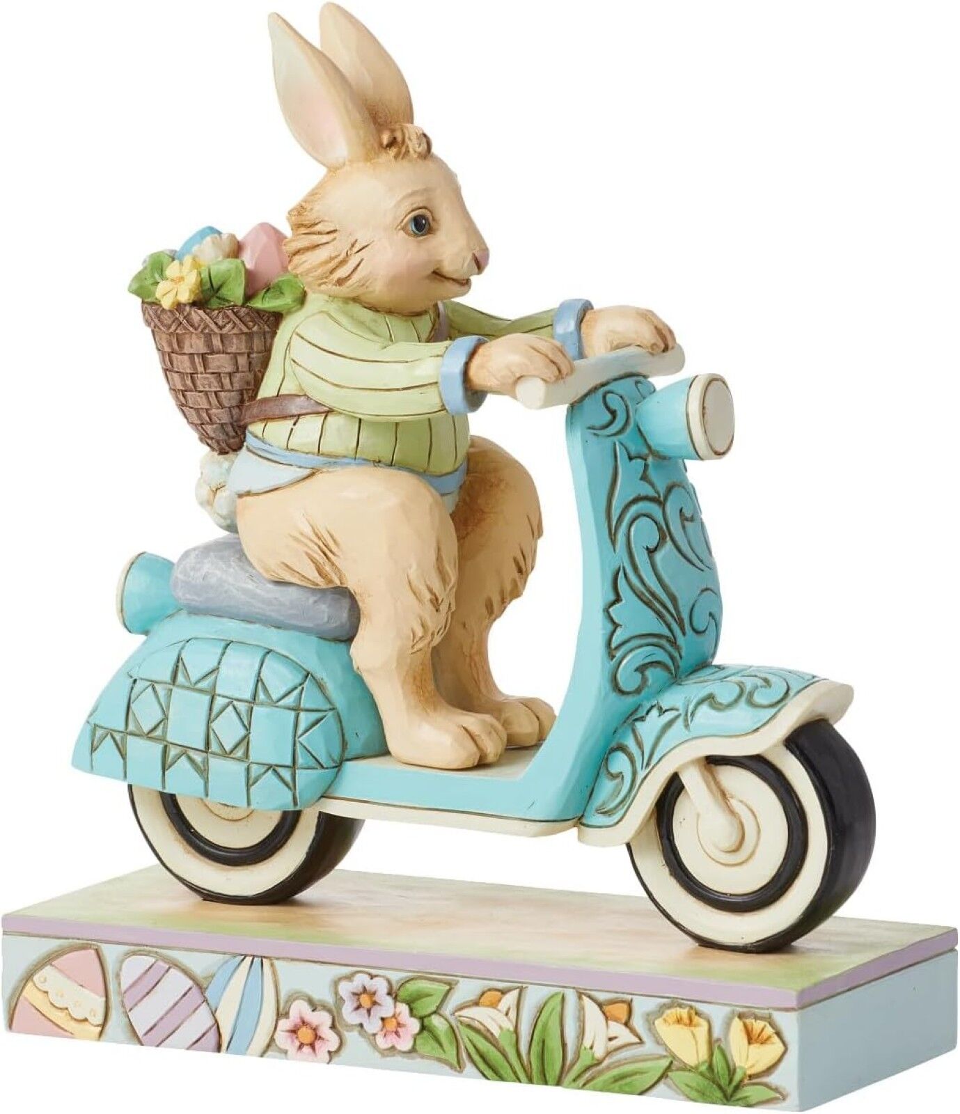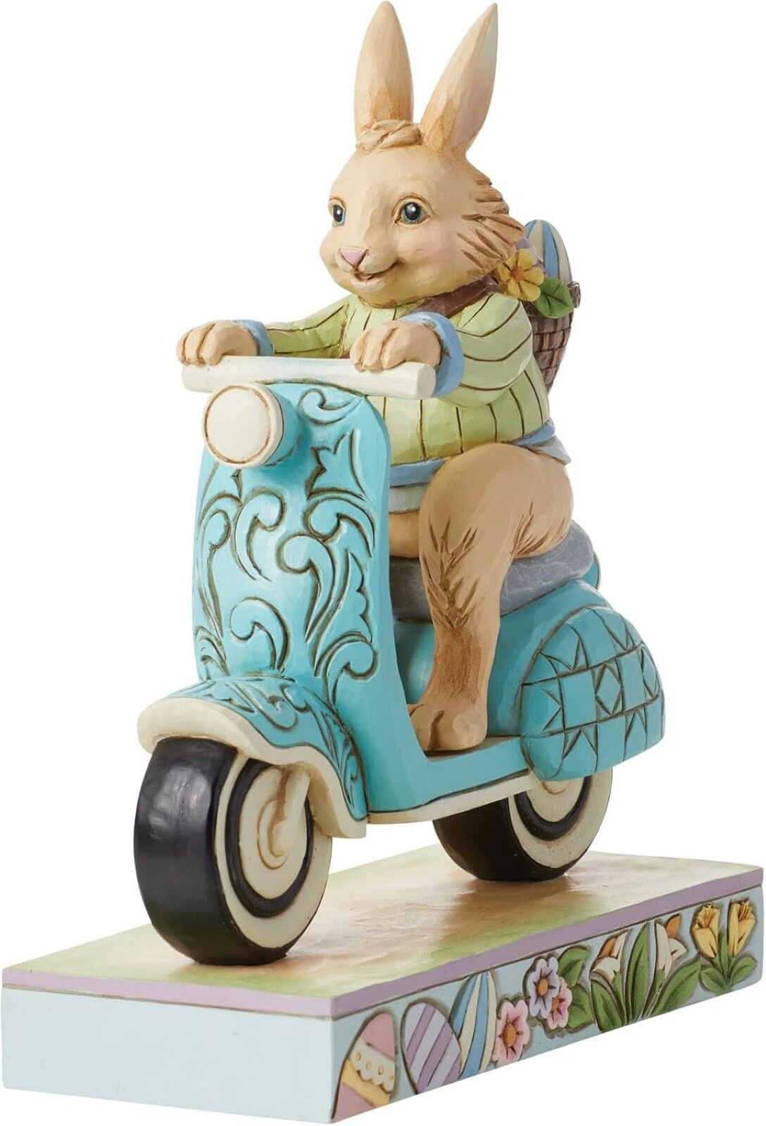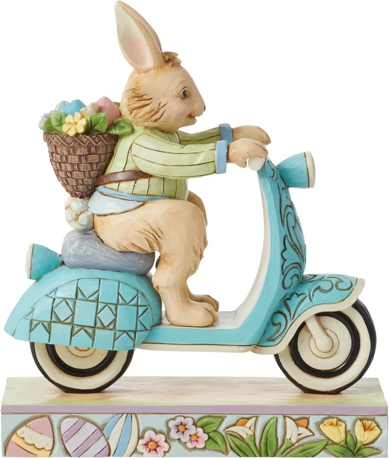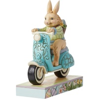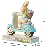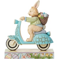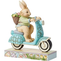 On a mission to deliver painted eggs and freshly picked flowers, this Easter bunny hops on a blue scooter decorated with rosemaling touches to be fancy while speeding by. Wearing a green jacket and smile, this figurine by Jim Shore adds fun flair to you