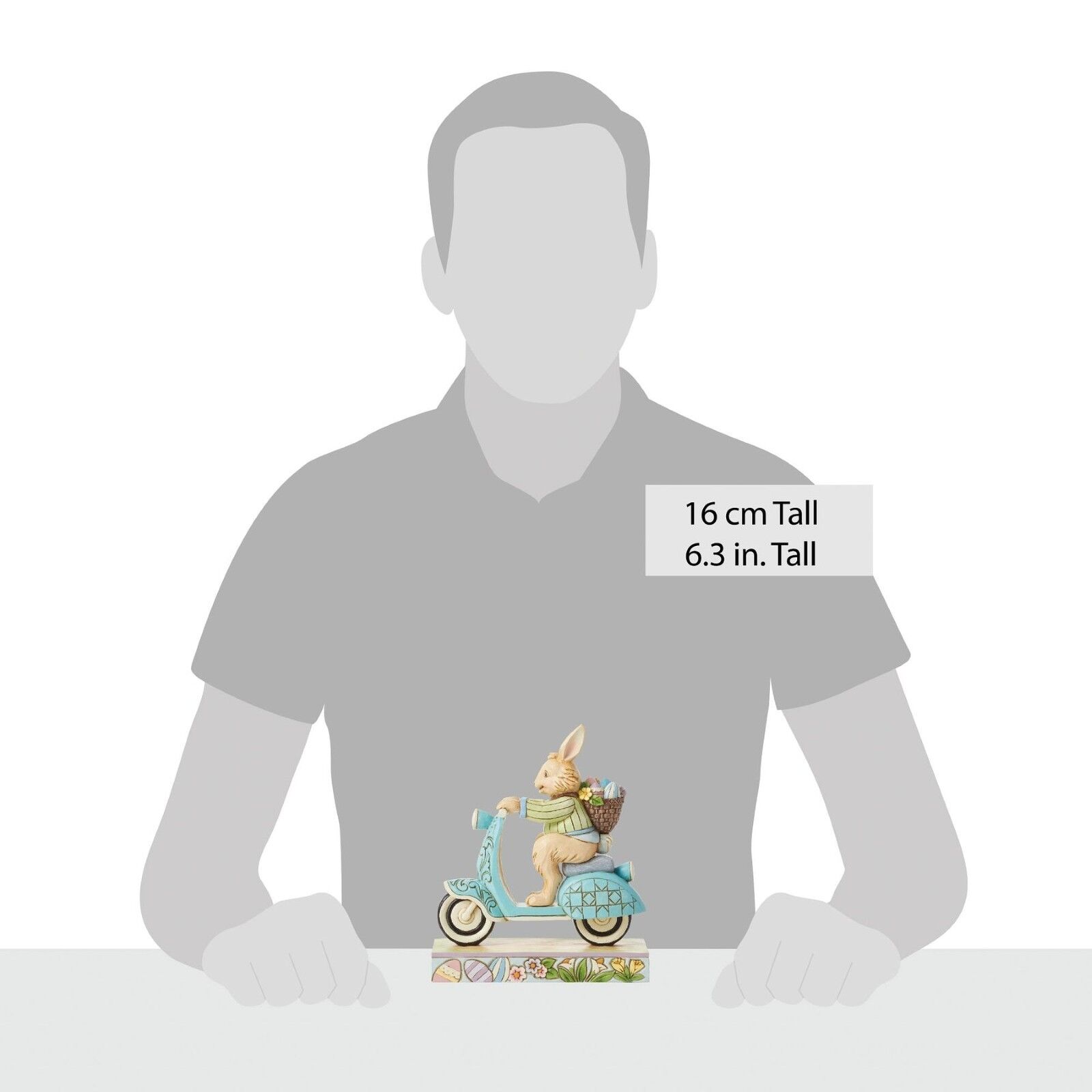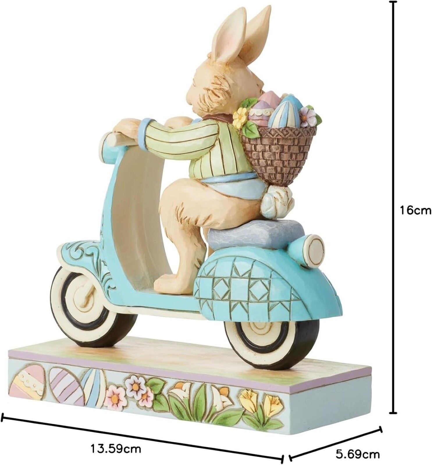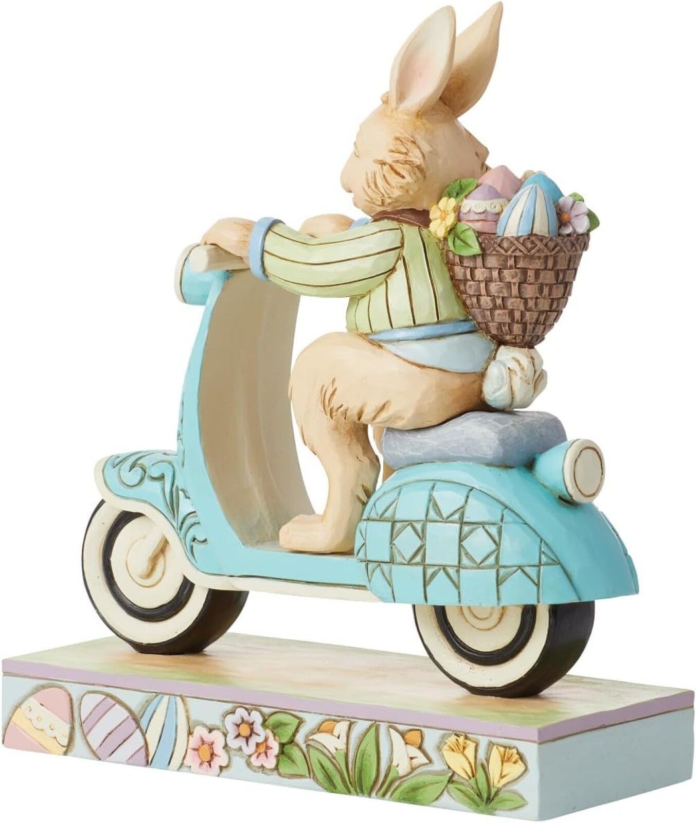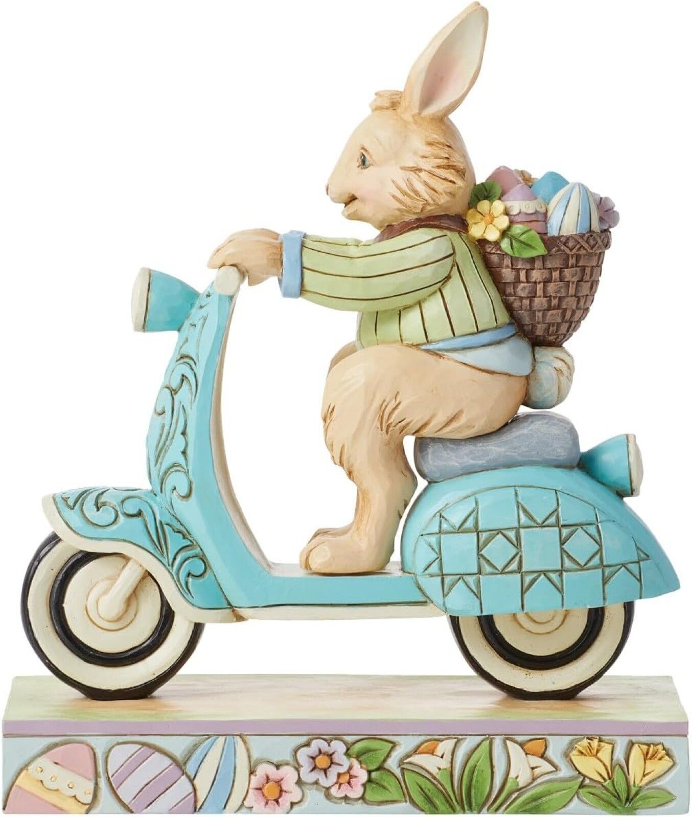 On a mission to deliver painted eggs and freshly picked flowers, this Easter bunny hops on a blue scooter decorated with rosemaling touches to be fancy while speeding by. Wearing a green jacket and smile, this figurine by Jim Shore adds fun flair to you
