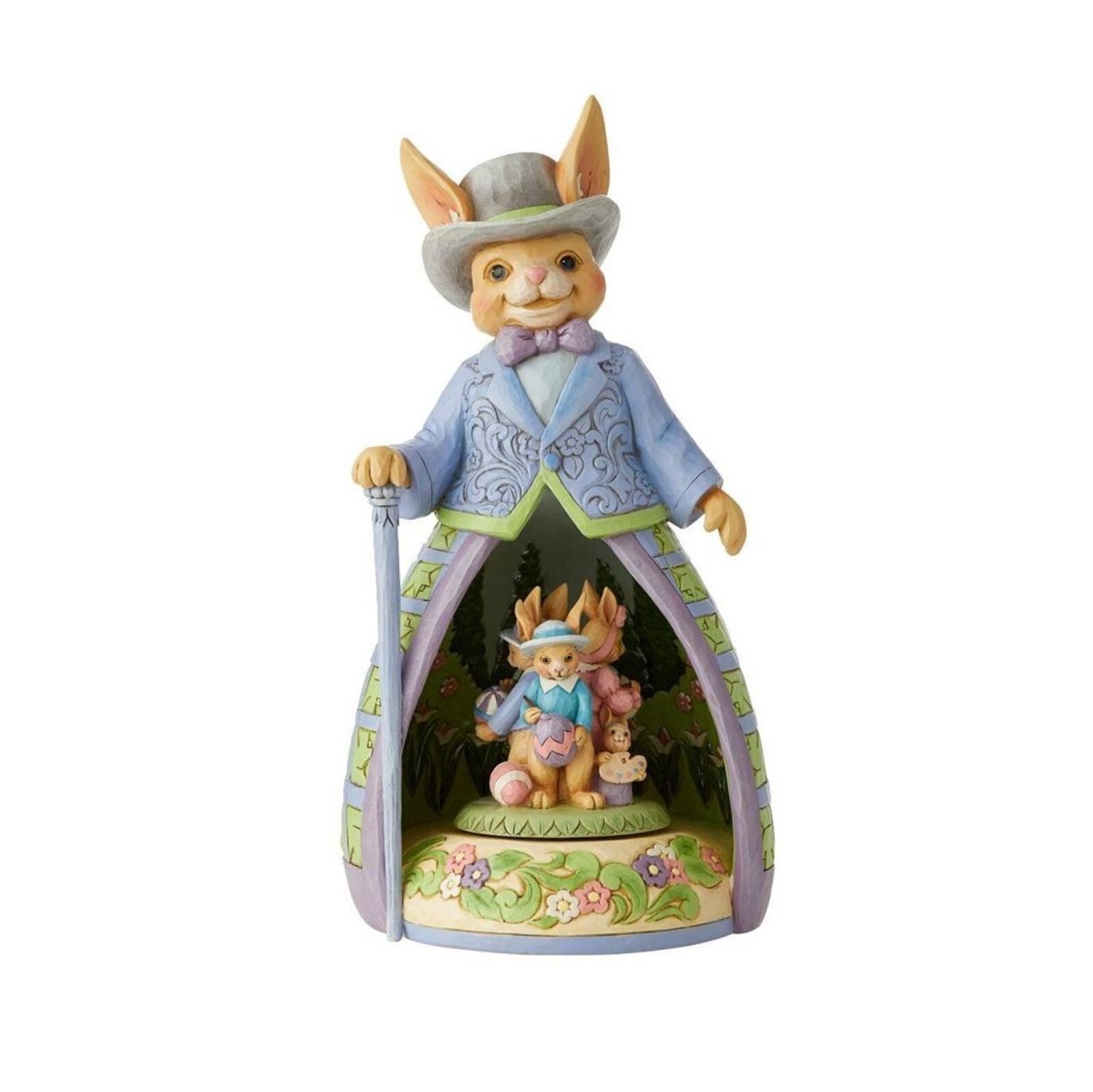 This delightful Jim Shore holiday figurine illuminates with color, LED light, and intricate detail. A blissful bunny in a patterned vest and bow tie offers flowers and well wishes this Easter. An inner alcove reveals a spinning scene of an egg hunt.