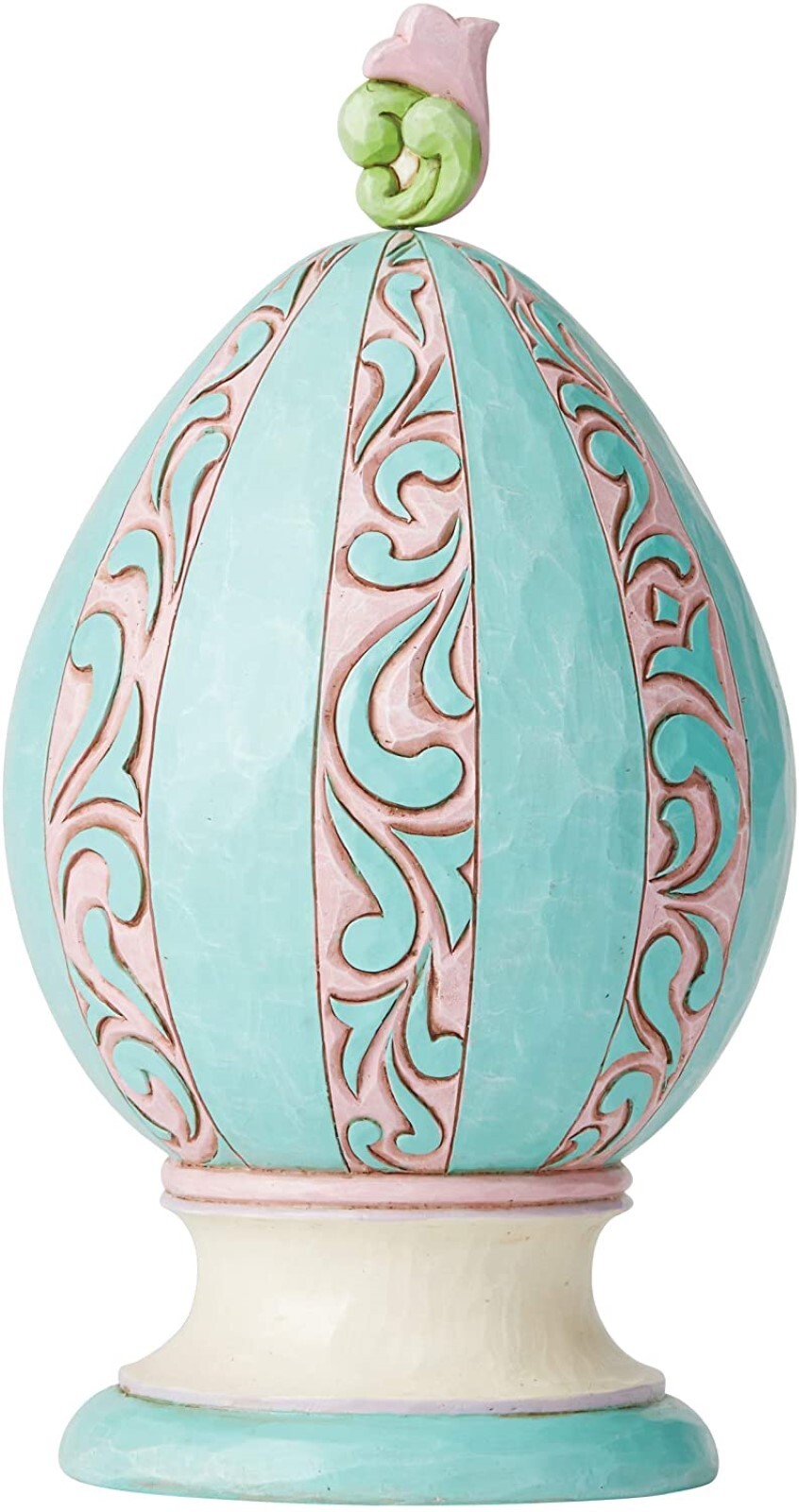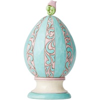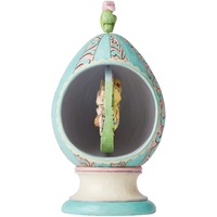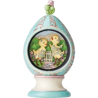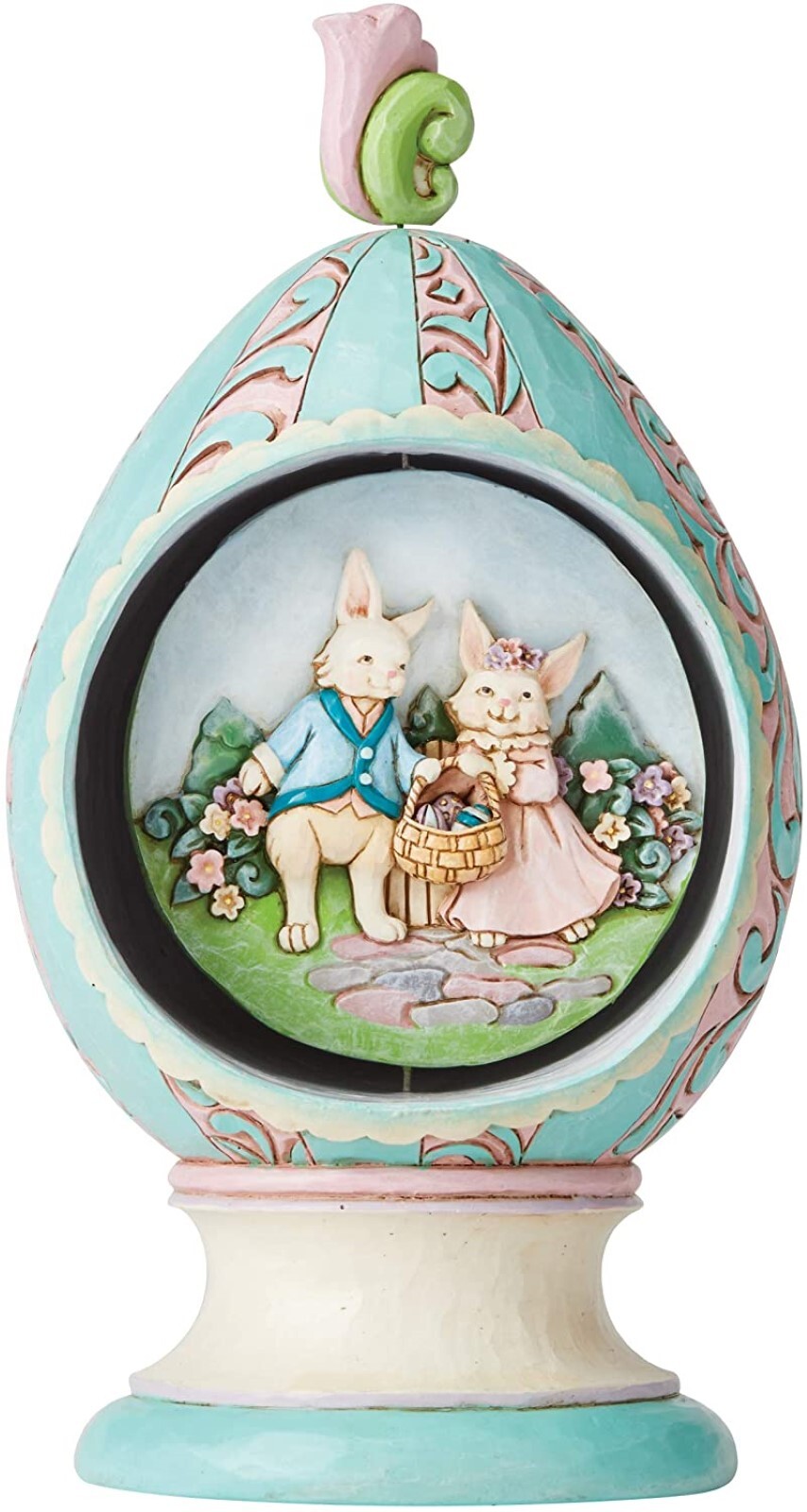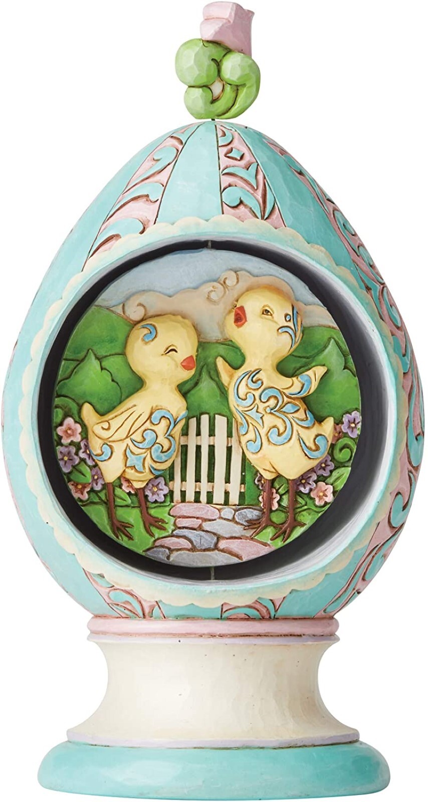 Stroll through Easter with this festive Jim Shore tabletop Easter egg. Simply turn the floral finial atop the egg to rotate the scene inside between two adorable Easter scenes. Chicks soak in the sun while a pair of bunnies jubilantly collect eggs.