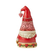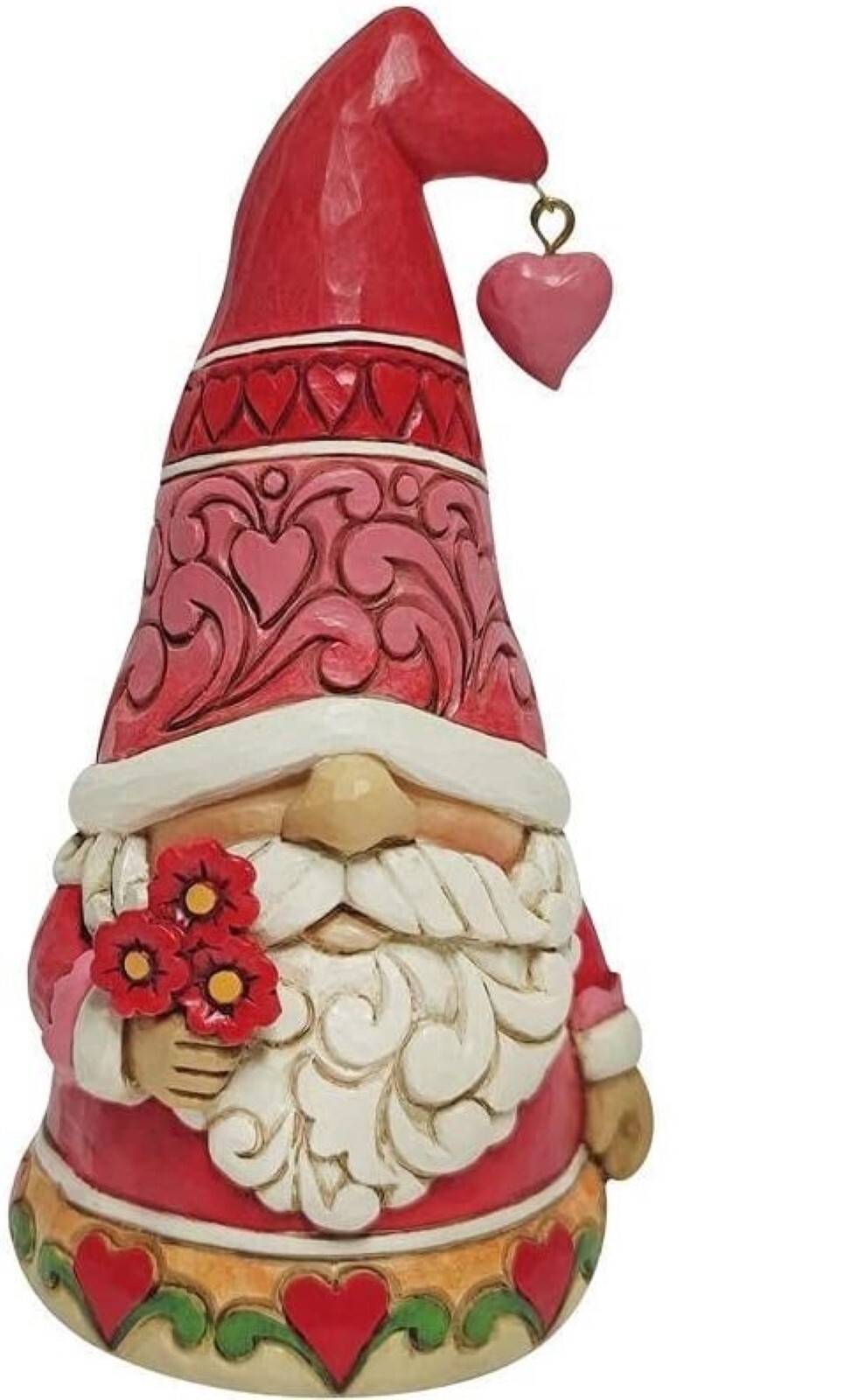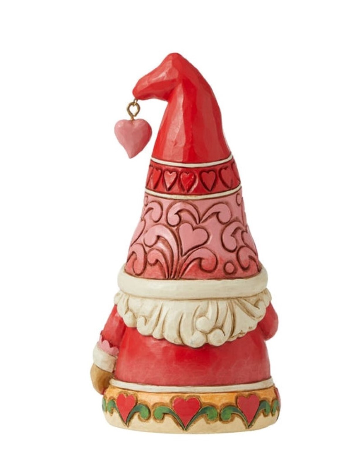 Carrying flowers, this red robed gnome is a vision of affection and fondness. Hat pulled down over his eyes, his cheeks rose with tenderness. Hat and robe rimmed in hearts, this 5 inch gnome statuette by Jim Shore spreads love wherever he's set.