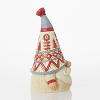 No one knows gnomes like Jim Shore! Jim has put a playful spin on Christmas. This holiday gnome wears a tree and flower patterned hat with a warm cozy white textured sweater and mustached smile.