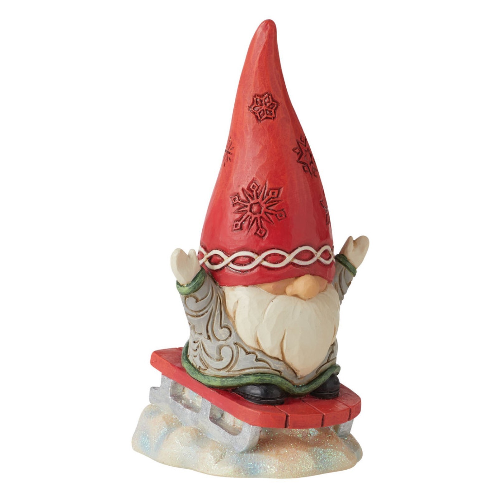 Nobody knows gnomes like Jim Shore. Creating hundreds through the years, each gnome friend is a collectible marvel of charm and craftsmanship. This sledding gnome is having Snow-much fun! Hands in the air, he races down a hill with snowflake hat.