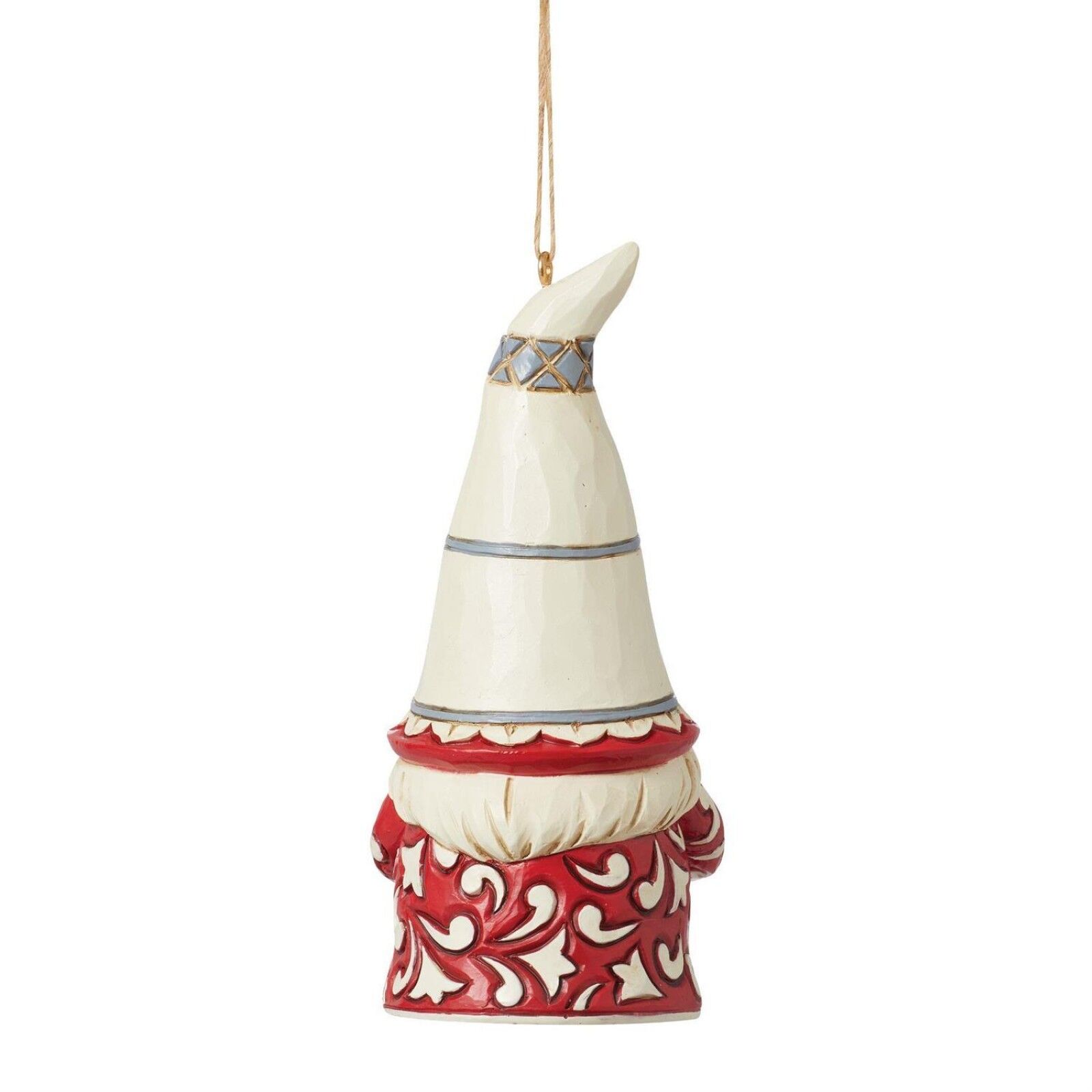 This red and white Christmas gnome from Jim Shore smiles giddily from your Christmas tree. Wearing a Nordic inspired holiday hat featuring flowers and a reindeer, this little gnome holds a heart shaped wreath just for you. Celebrate the small things.