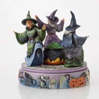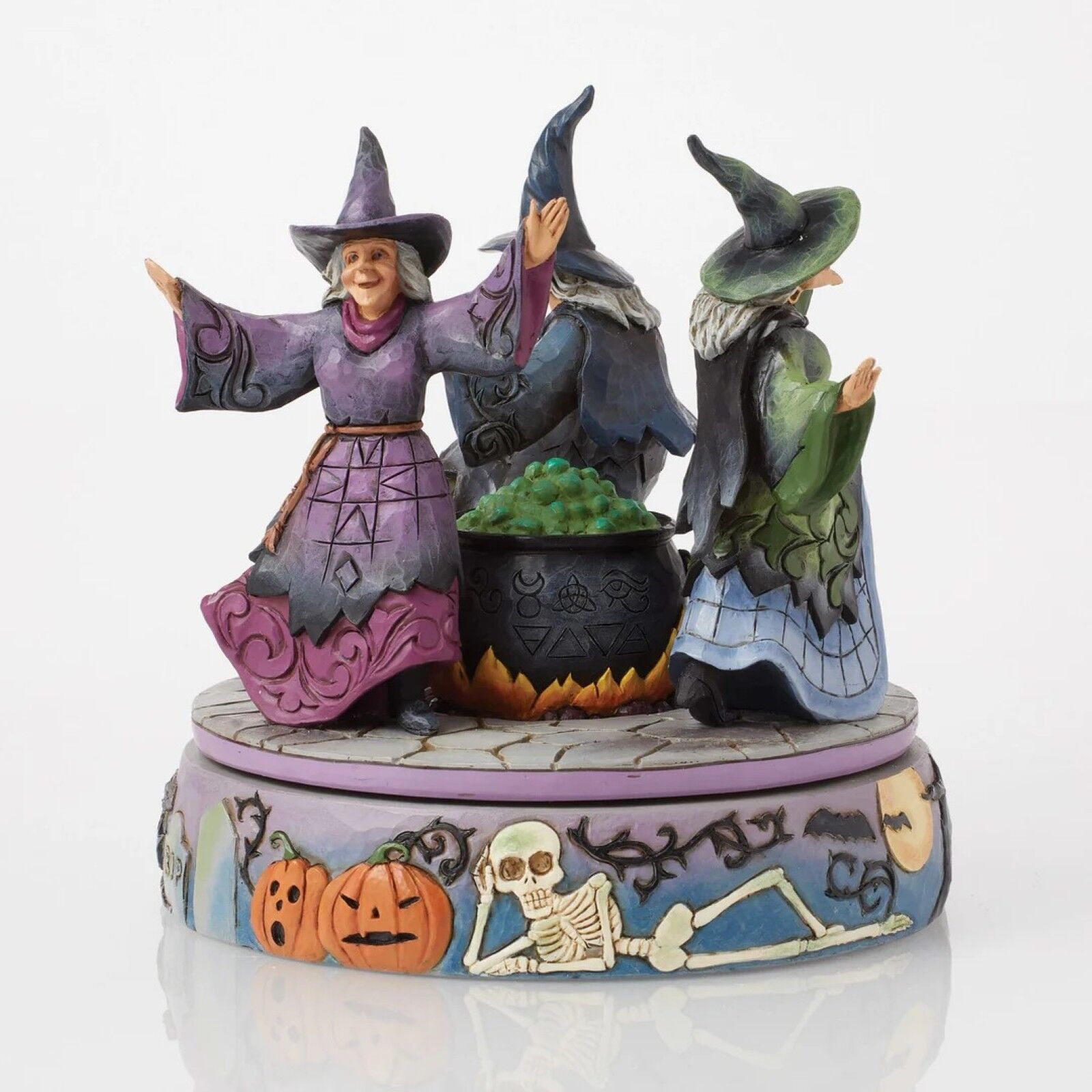 Enter the world of Halloween with this amazing hand-touch rotation figurine featuring three witches dancing around a bubbling cauldron. Adorned with jack-o-lanterns, skeletons, tombstones, spiders, snakes, black cats, and bats, it's a bewitchin