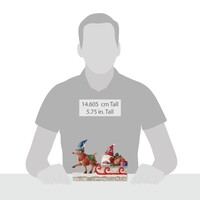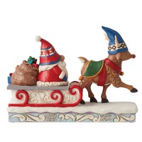This playful piece by Jim Shore features a jolly gnome in route to your holiday home. Lead by a dashing reindeer with gnome-like characteristics, this colorful winter-clad gnome enjoys a sleigh ride on a snowy day.