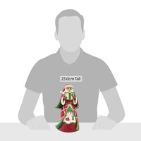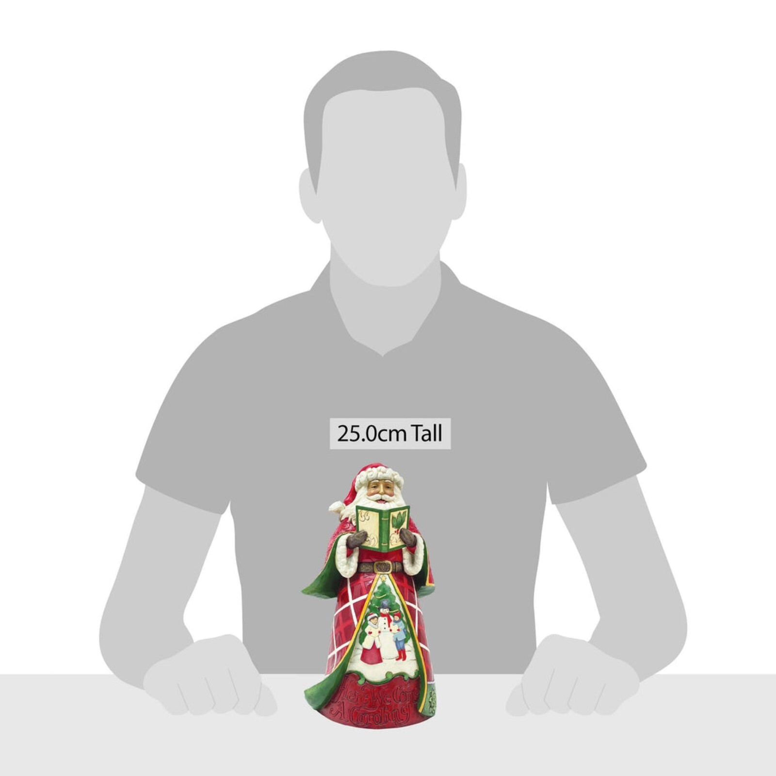 This colorful Jim Shore statuette features a singing Santa with a caroling scene. Santa's billowing patchwork cloak frames two carolers singing beside a snowman and Christmas tree. With luxurious patterns and poinsettias, this figurine is a classic.
