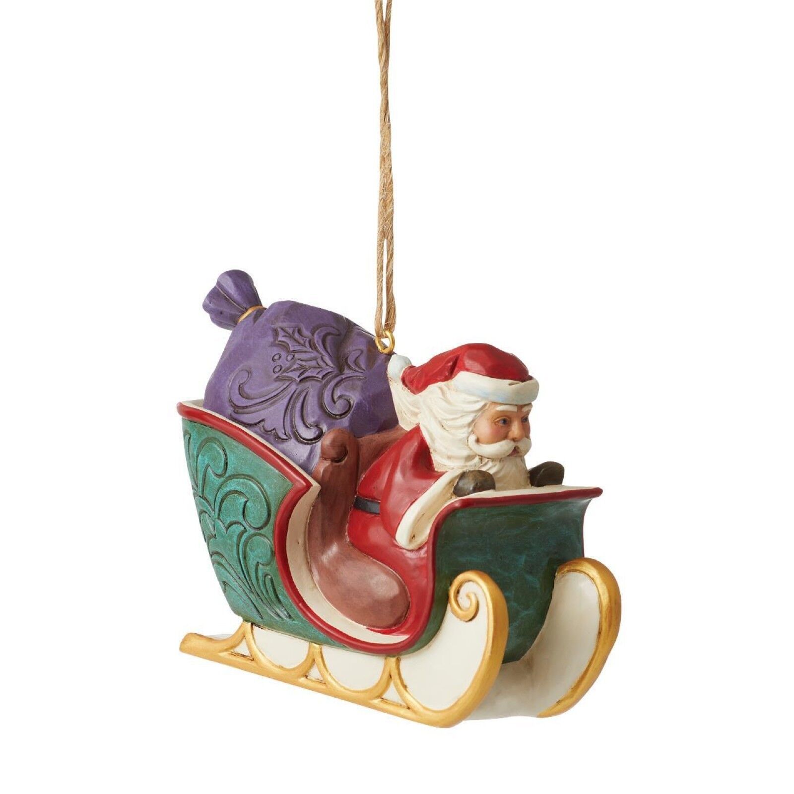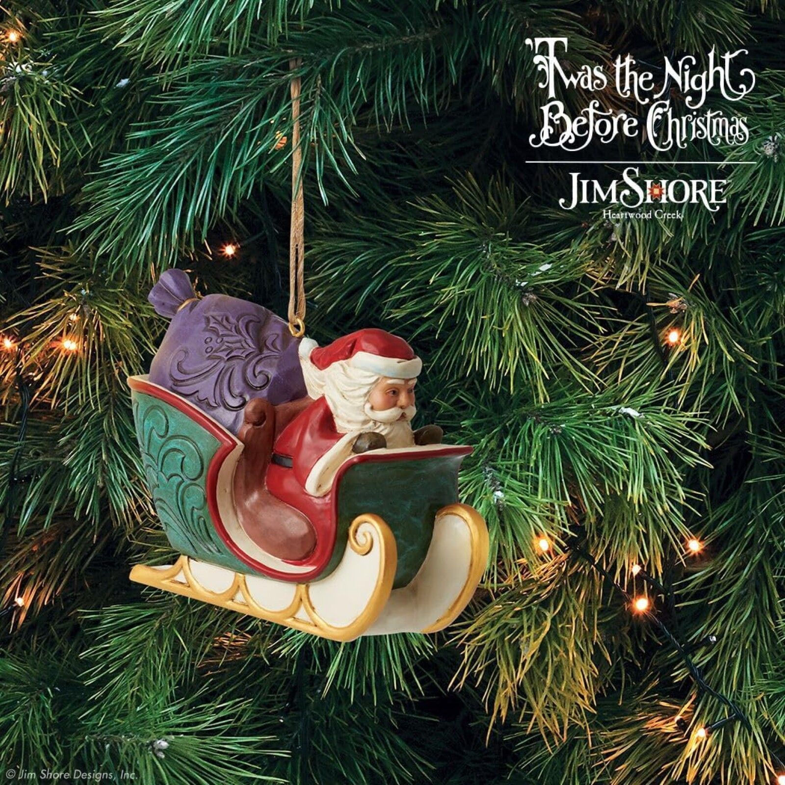 Taking inspiration from the memorable Clement Clarke Moore poem, Jim Shore creates a Santa Claus ornament to headline The Night Before Christmas. Racing in his rosemale patterned sleigh, Santa steers his reindeer through your tree, presents in tow.