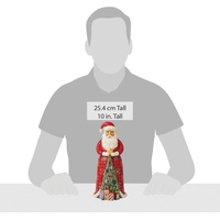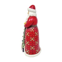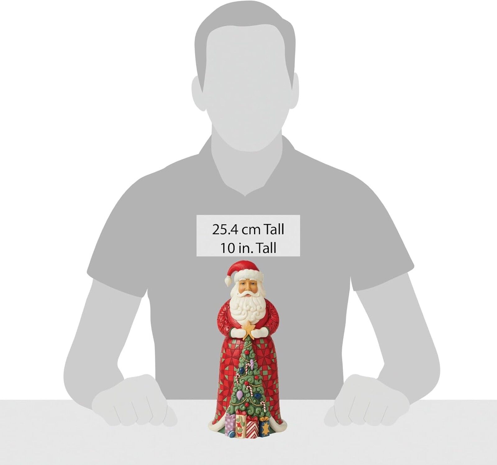 This lovely Santa figurine by Jim Shore features father Christmas placing a star a top a striking Christmas tree framed within his cloak. With red and green patchwork patterning, this ornamental Santa steals Christmas with color and craftsmanship.