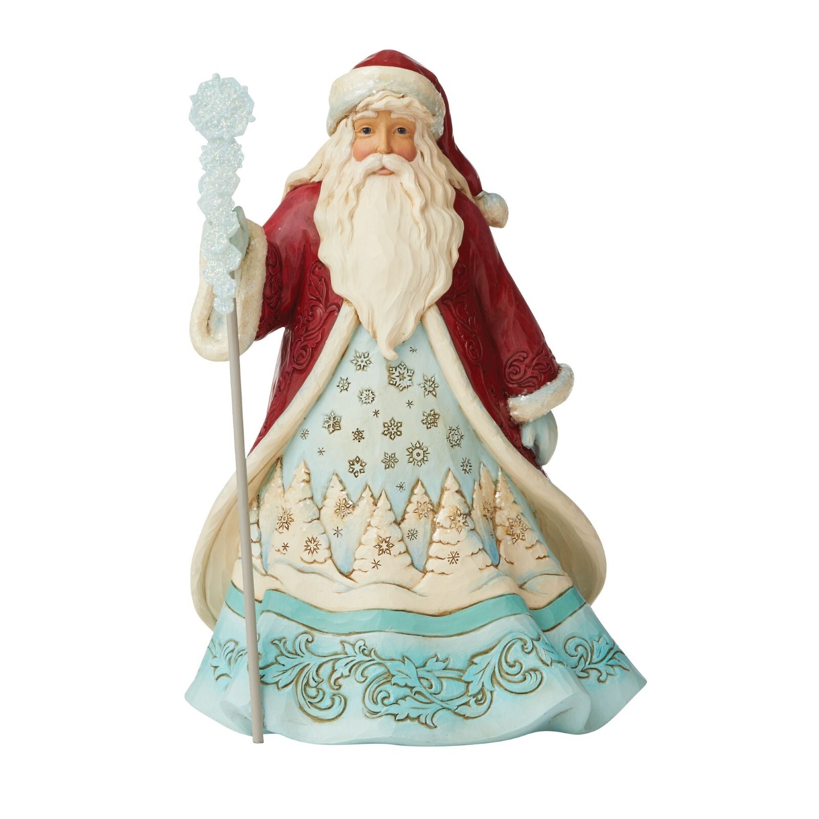 With a staff tipped in snowflakes, this lavish Jim Shore Santa is a vision of winter wonder. In cool blues and sparkling detail, Santa's cloak displays a stupendous snowy scene in the forest. Santa knows, ice and snow can warm the soul.