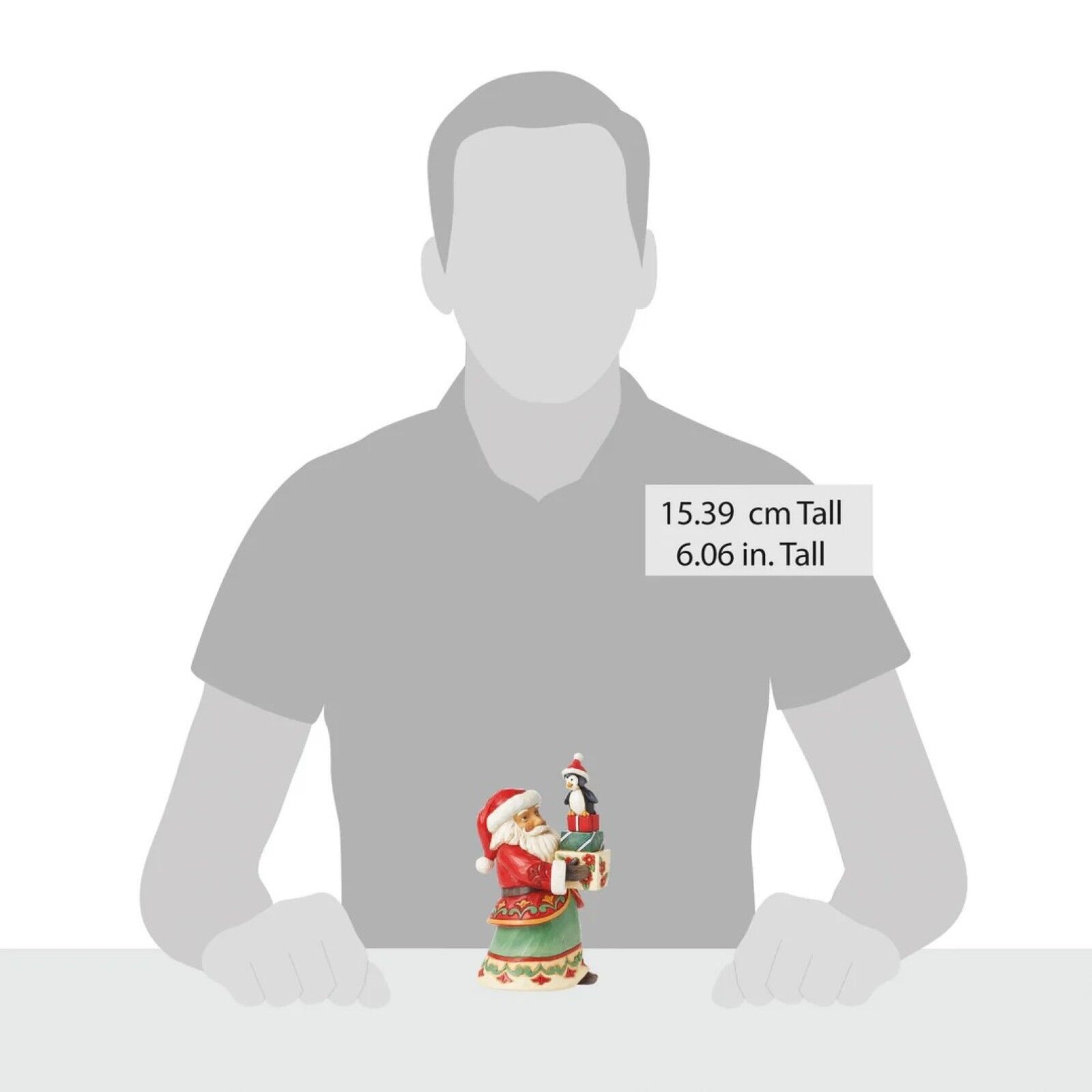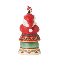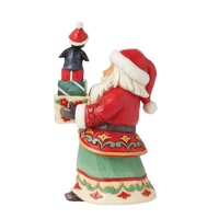 This pint sized Santa from Jim Shore carries a collection of prettily wrapped presents with the help of his holiday penguin friend. Wearing floral patterned robes, Santa is on a mission to deliver joy and toys all around the world.