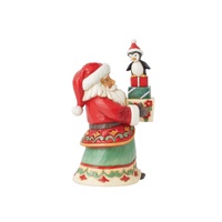 • Jim Shore Heartwood Creek "Loaded Up With Christmas Cheer" Pint Collection Santa Holding Stack of Gifts with Penguin On Top Figurine
