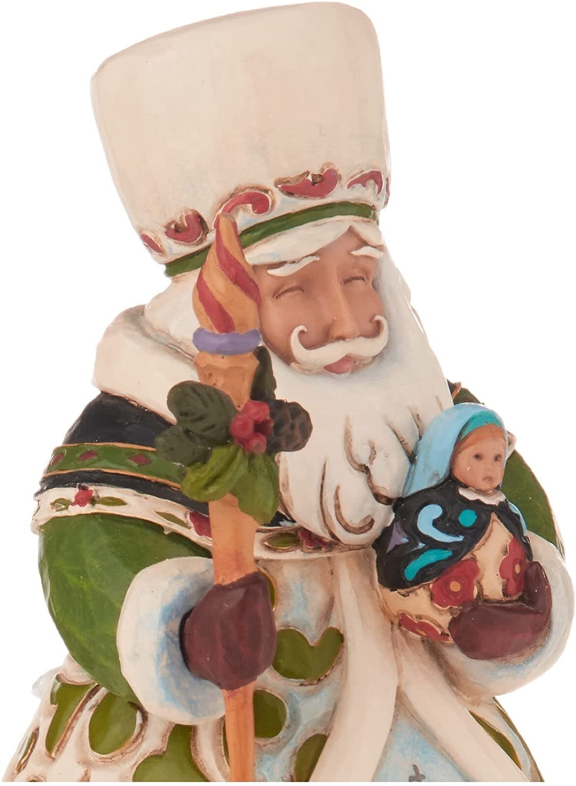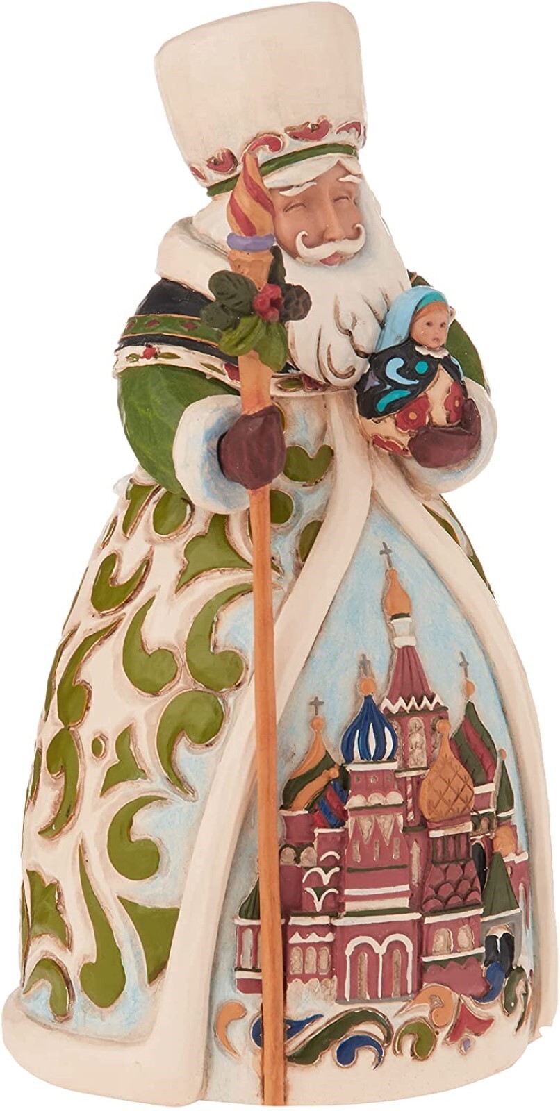 The Santas Around the World collection showcases Christmas traditions from cultures near and far.  Father Christmas travels to the land of Russia. He holds a Russian doll and staff while displaying a quaint scene of St. Basil's Cathedral.