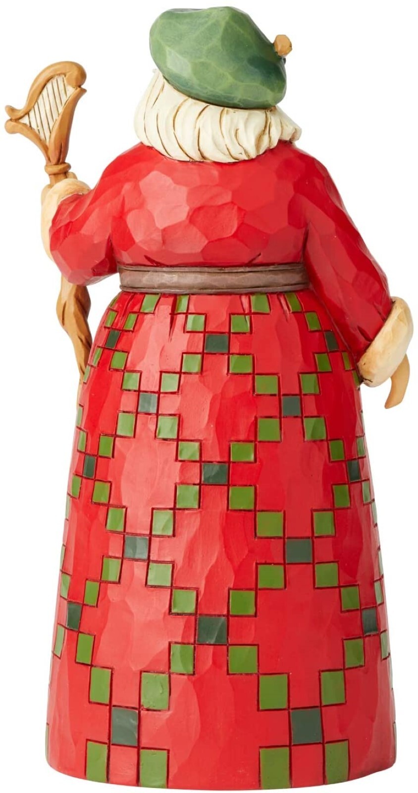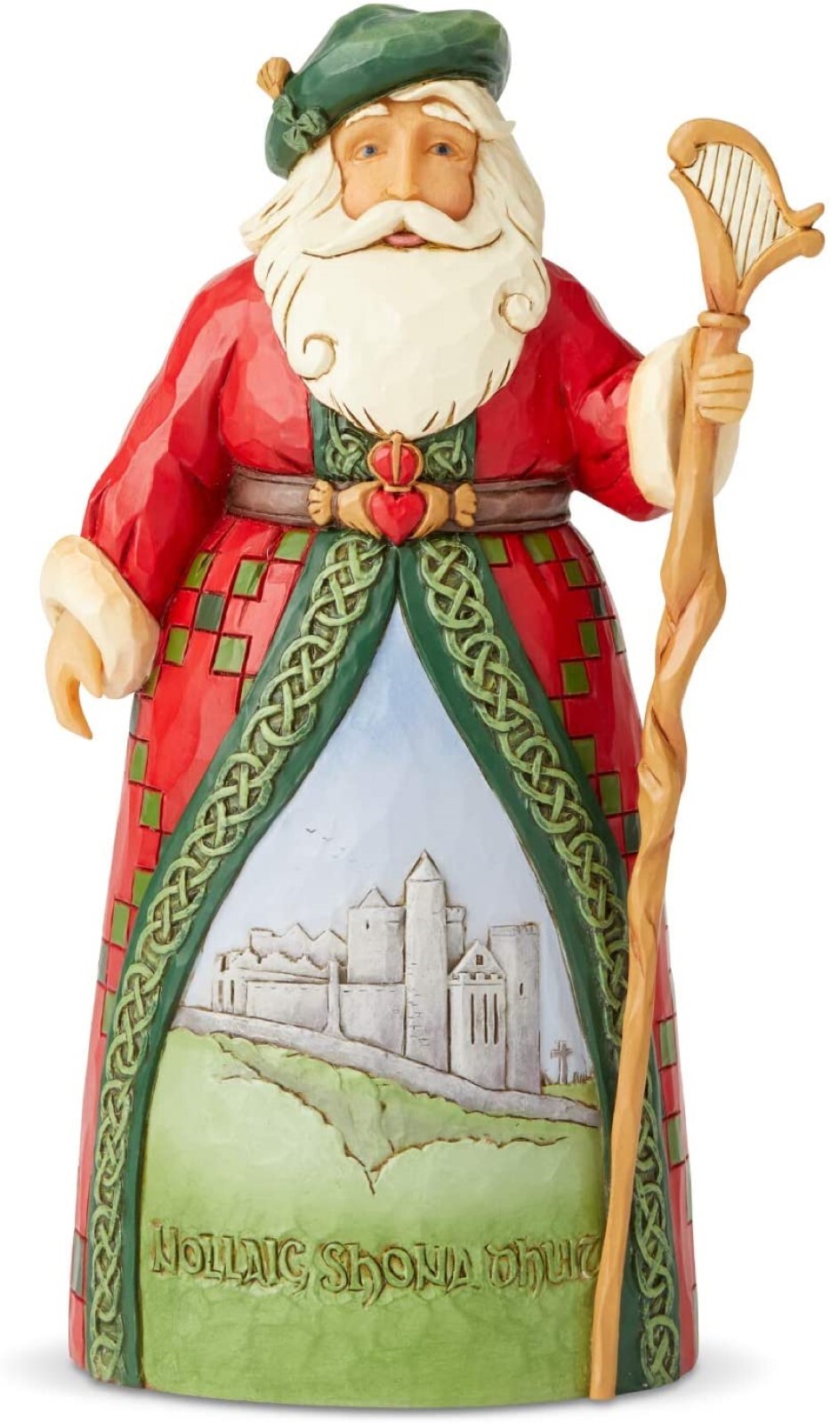 Father Christmas dons his luckiest garb in this stunning tribute to the green country. With a newsboy cap, harp topped staff, castle scene and claddagh clasped belt, this Jim Shore Around The World Santa shows of his Irish side.