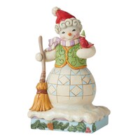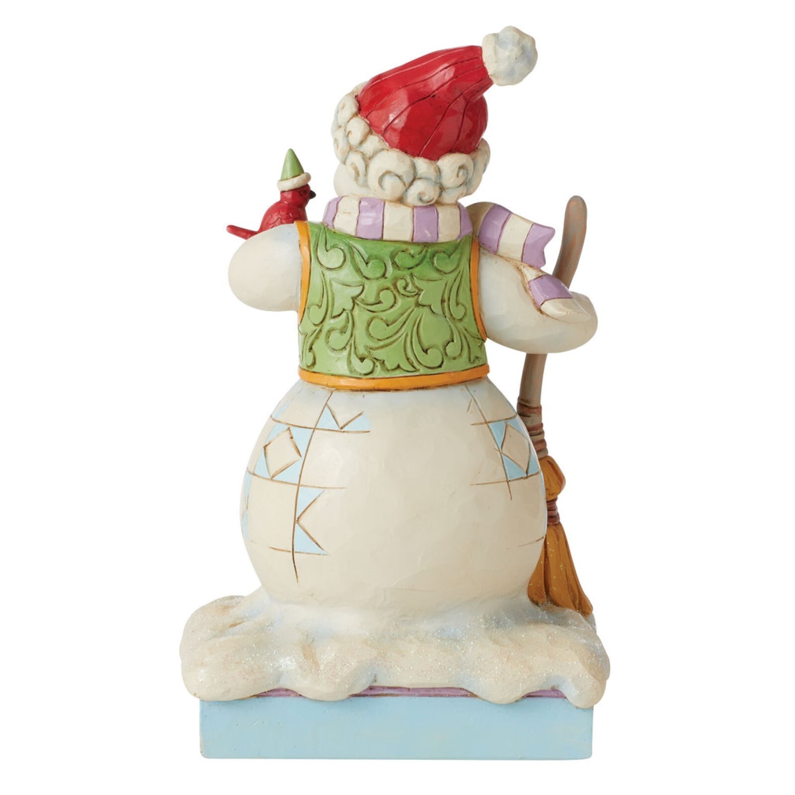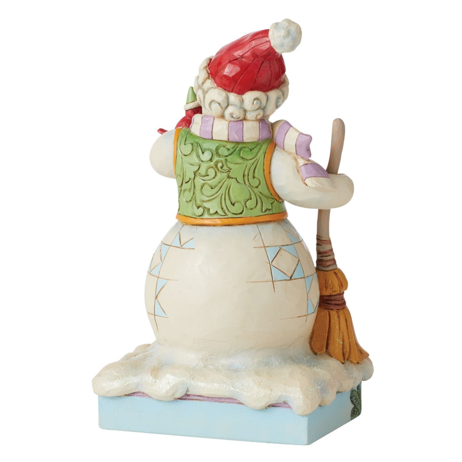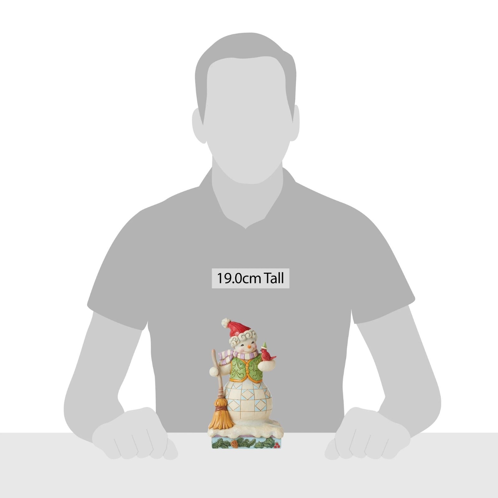 Holding a broom, this cheery snowman prepares for a winter of smiles and song. Holding a sweet cardinal in his hand, who is wearing a matching hat, the pair share warm Season's Tweetings to your family this holiday season.