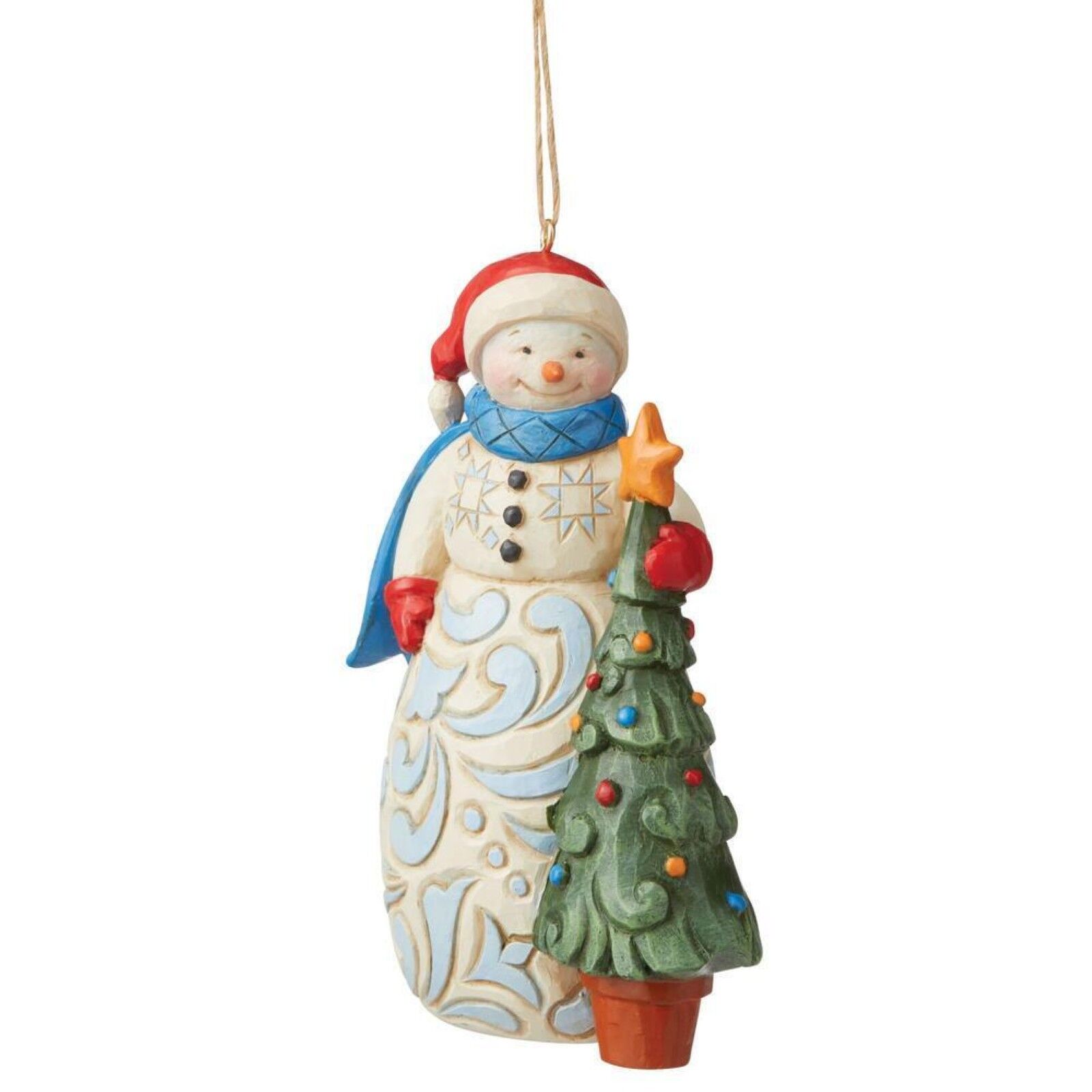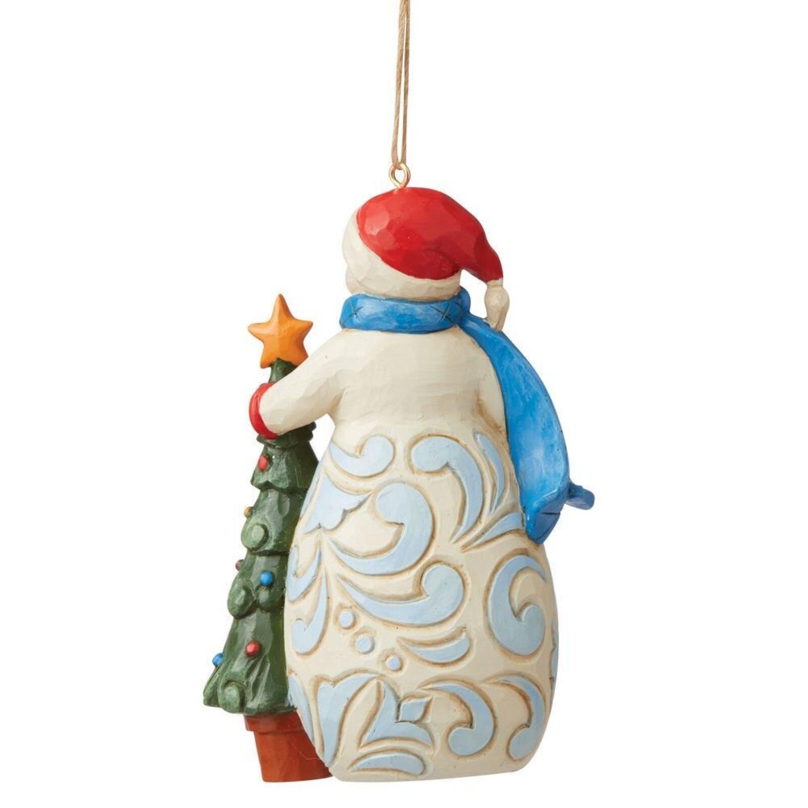 This Jim Shore snowman ornament cherishes every moment of Christmas. Bundled in a scarf and Santa hat, he sets up a tree lovingly. Wearing gloves he makes sure the little pine doesn't blow away in the blustery winter day.