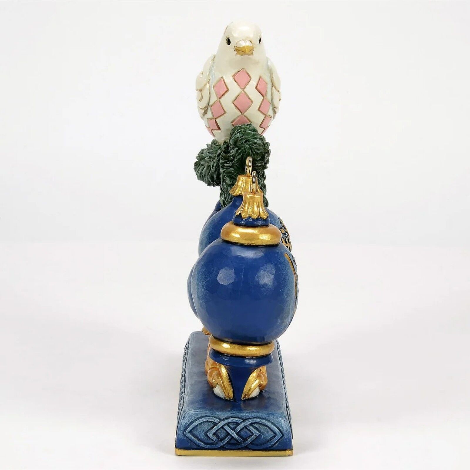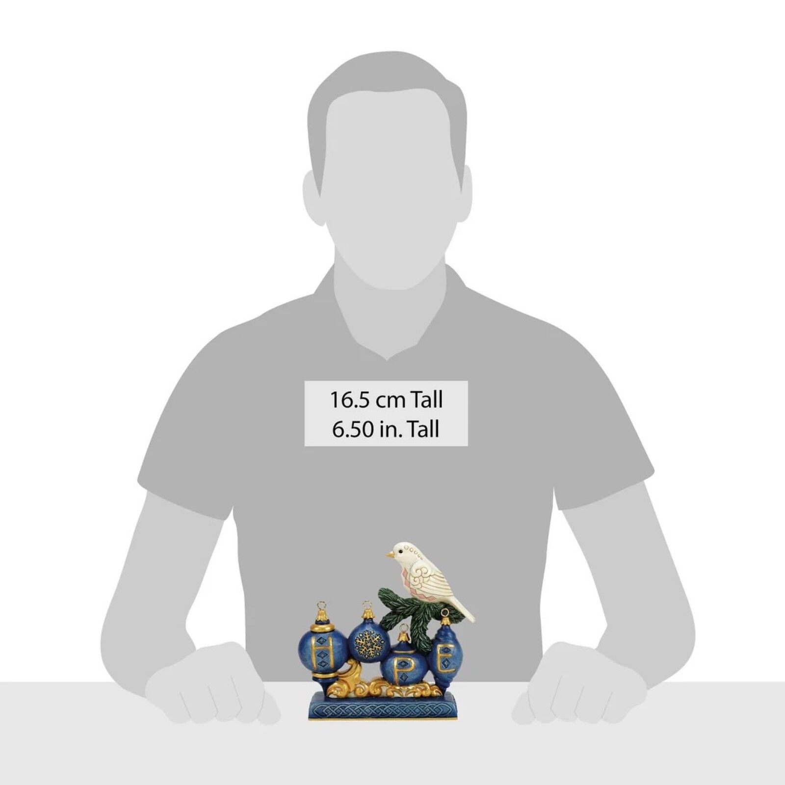 This elegant Jim Shore ornament features a beautifully patterned dove resting on a pine sprig, with a blue ornament adorned with a golden snowflake hanging gracefully below. The rich colors and details bring a sense of peace to your holiday home.