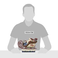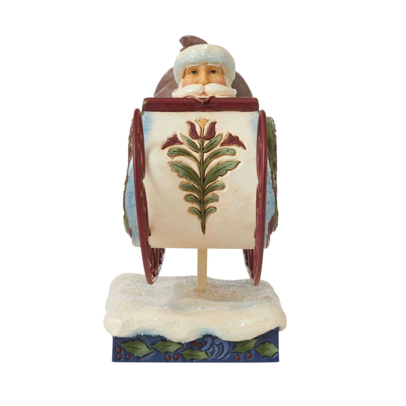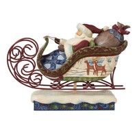 Cozy in his sleigh, Santa steers from the comfort of a blanket while his cargo of presents rests behind him. Levitating above the snow with the help of reindeer and magic, this Jim Shore Santa delights and mystifies all season long.