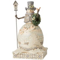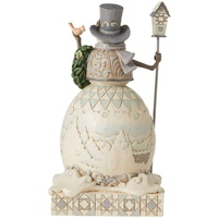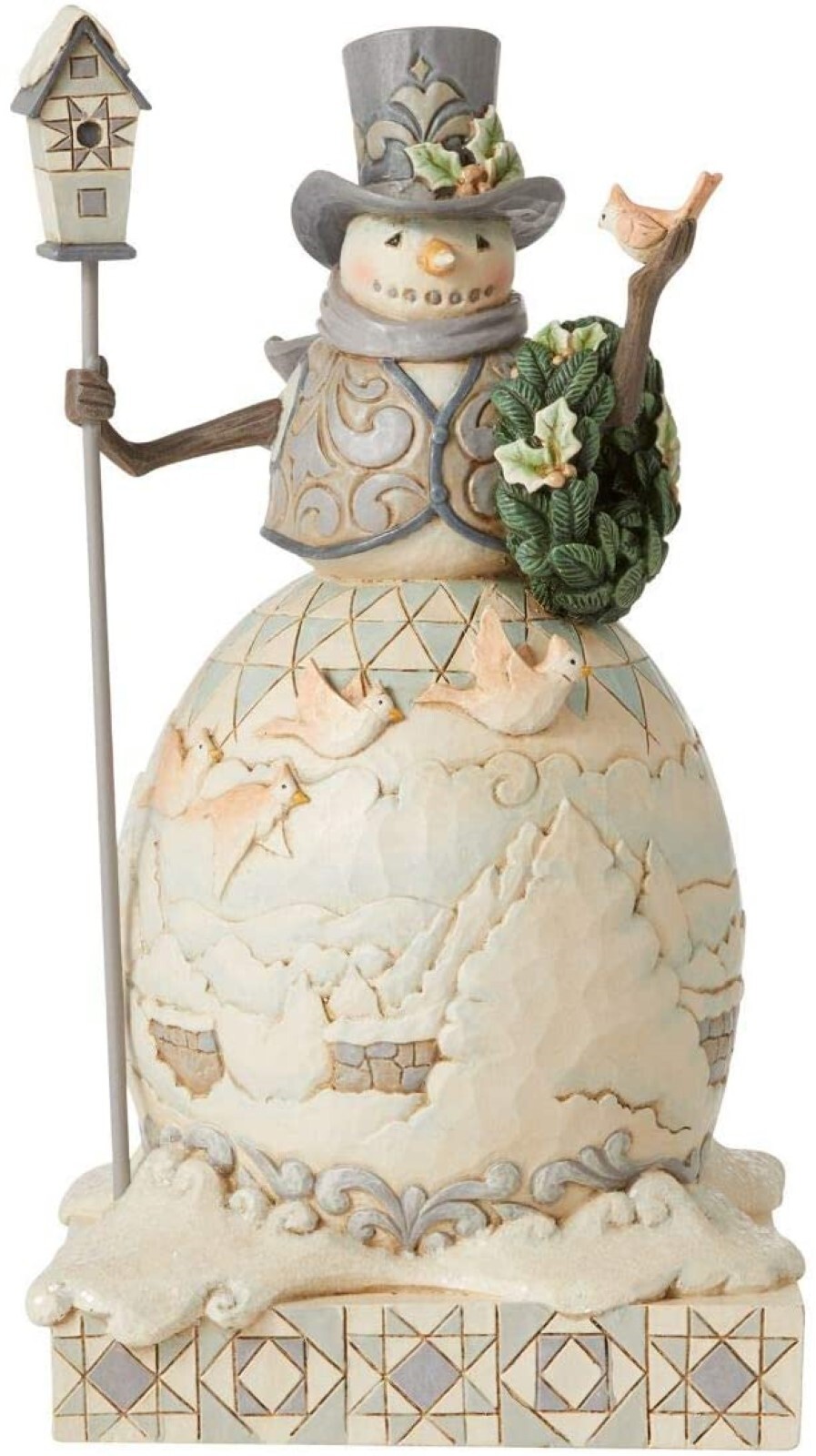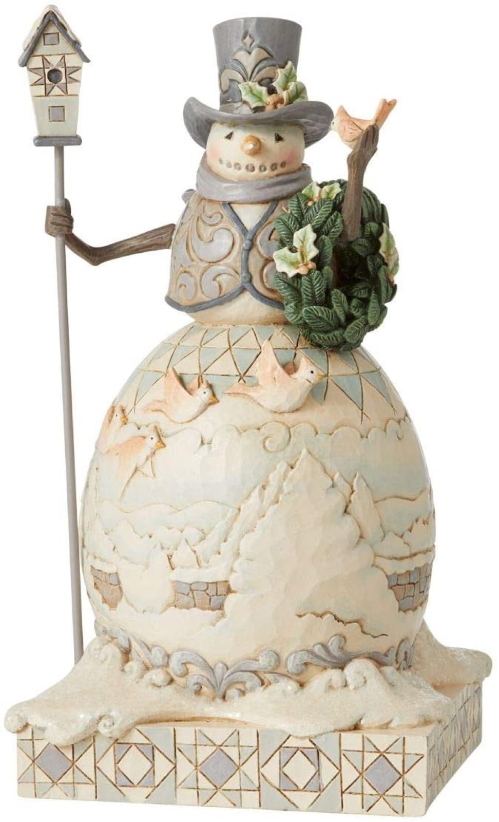 Holding a birdhouse staff, this snowman welcomes wings this winter as cardinals fly by his side whistling in the wind. Together the birds and their guide bring joy to winter days. This intricately crafted piece is stunningly sweet.