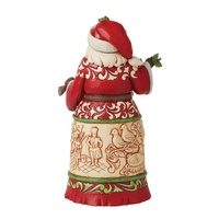 This enchanting Worldwide Event Santa by Jim Shore celebrates the 12 days of Christmas with a wrap around carving of true love's gifts. With each day represented, birds, leaping lords, and pipers pattern Santa's robes as he holds a pear tree branch in hi