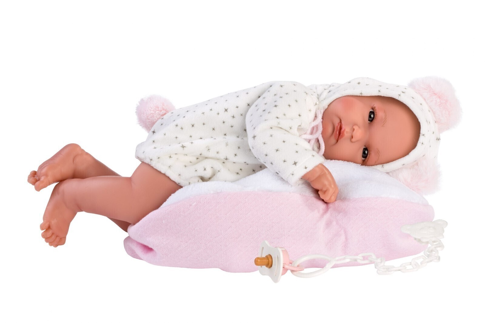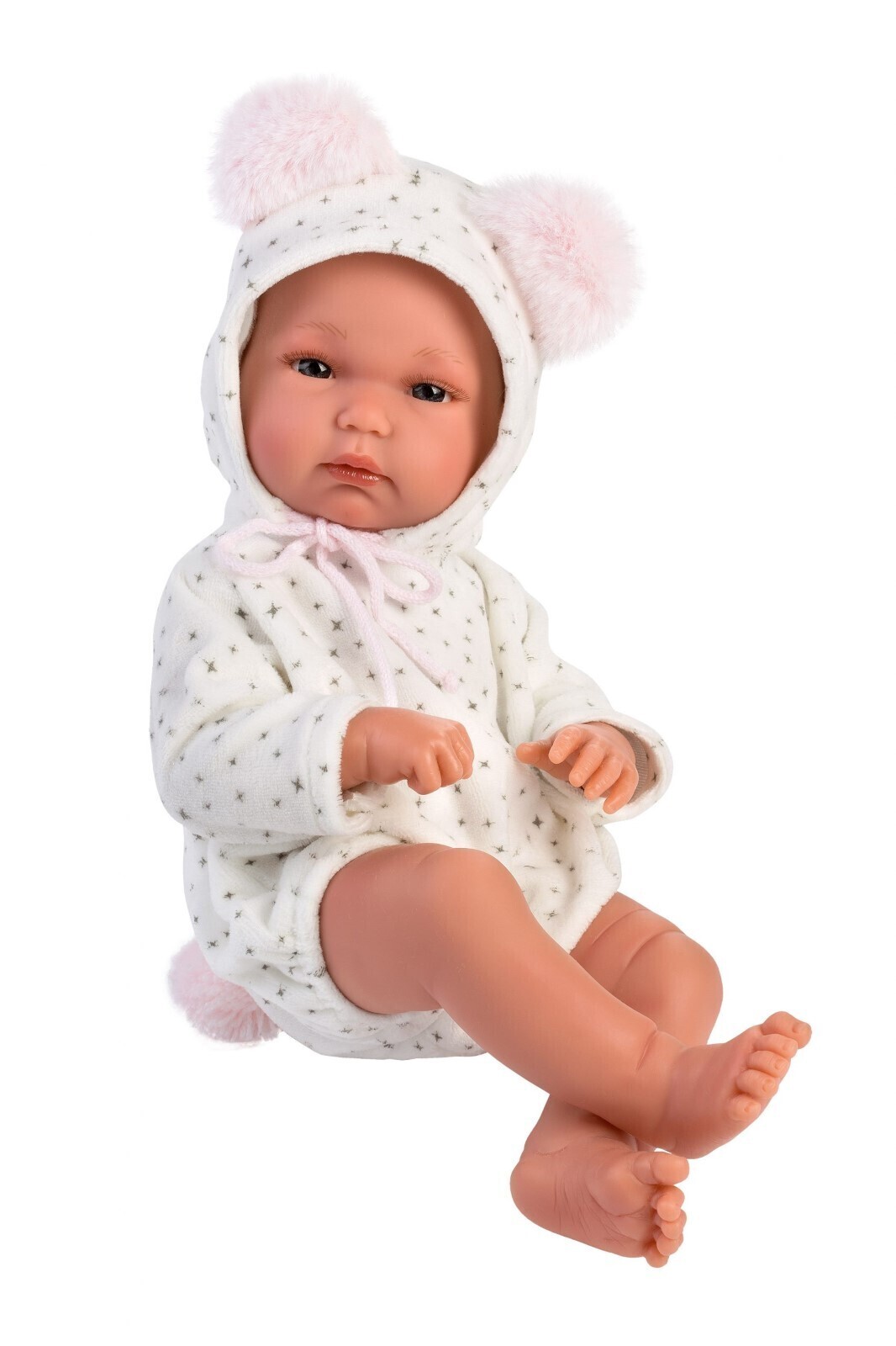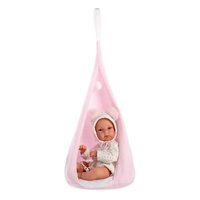 The Llorens Baby Doll Bimba Rosa has a vinyl body and is dressed like a real baby in a star patterned white romper suit with hood. The hood has little ears and the romper suit includes a pom-pom tail. She comes with her own cosy swing.