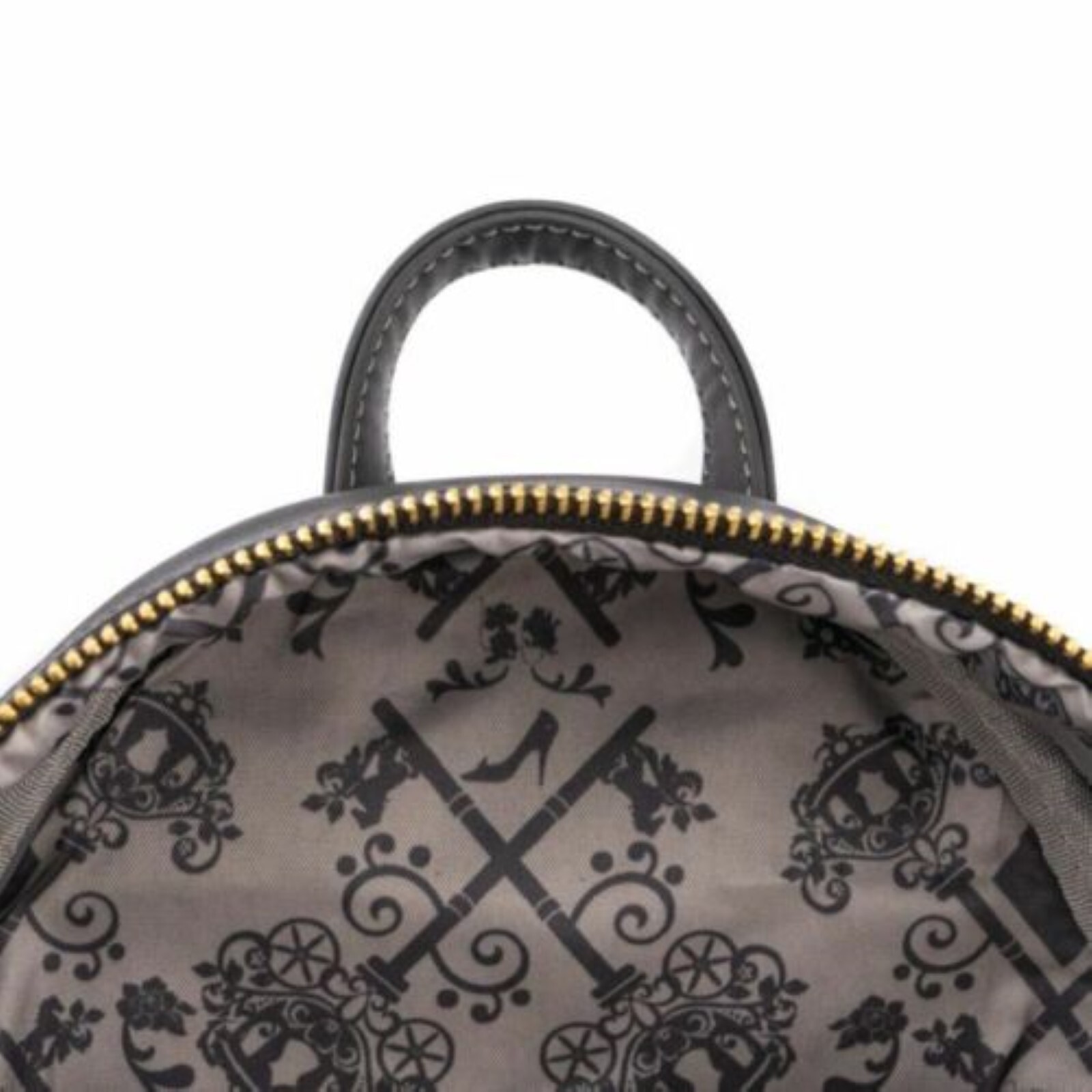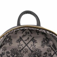 The Loungefly Disney Cinderella Evil Stepmother and Stepsisters Villains Scene Mini Backpack is made of vegan leather (polyurethane). Bag has adjustable shoulder straps, metal hardware, and features: applique, metallic, and printed details. Take note of the coordinating pattern of the inside lining fabric.