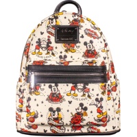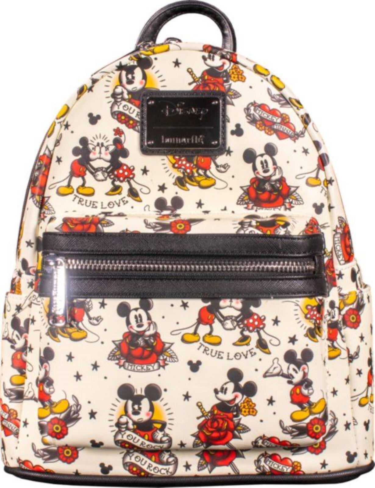 This star-dotted accessory features Mickey in various poses combined with artistic elements of traditional American tattoo designs. Each beautifully illustrated Mickey is featured in a bold black, red and yellow colour scheme, accompanied by striking flowery motifs, banners and the love of his life, Minnie Mouse! Vegan-friendly leather coloured white highlights the boldness of the all-over print and the design is completed with Loungefly’s signature enamel plaque taking its place on the front of the backpack.