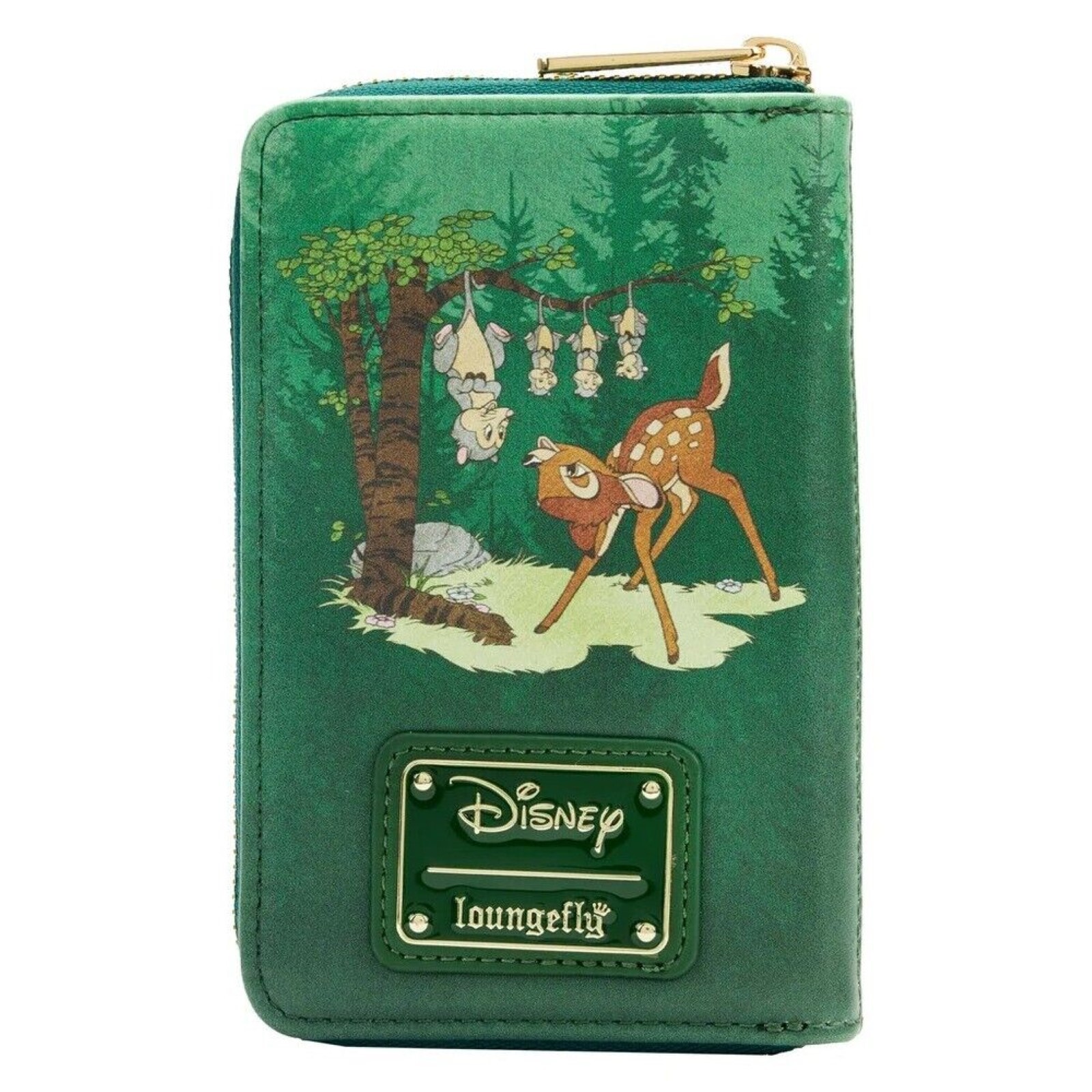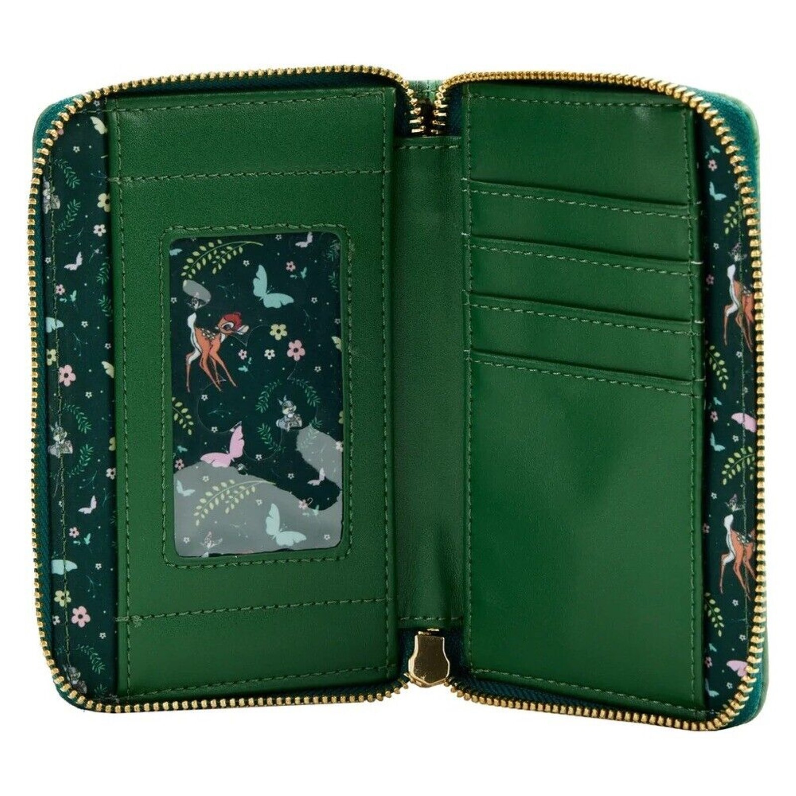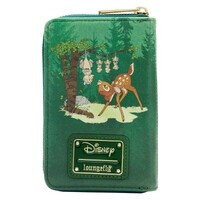 Bring the lessons of the forest to life with this Loungefly Disney Bambi Classics Books Zip Around Wallet. Bambi’s adorable face, surrounded in lush detail, by flowering trees and a butterfly peeks through a forest green background. On the back, Bambi makes another appearance beneath delightful opossums that hang upside down in a tree.