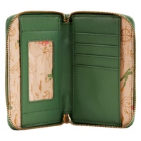 The Loungefly Peter Pan Book Zip Around Wallet is made of vegan leather (polyurethane). Wallet zips closed, has metal hardware, and features printed details. Take note of the coordinating inside lining.